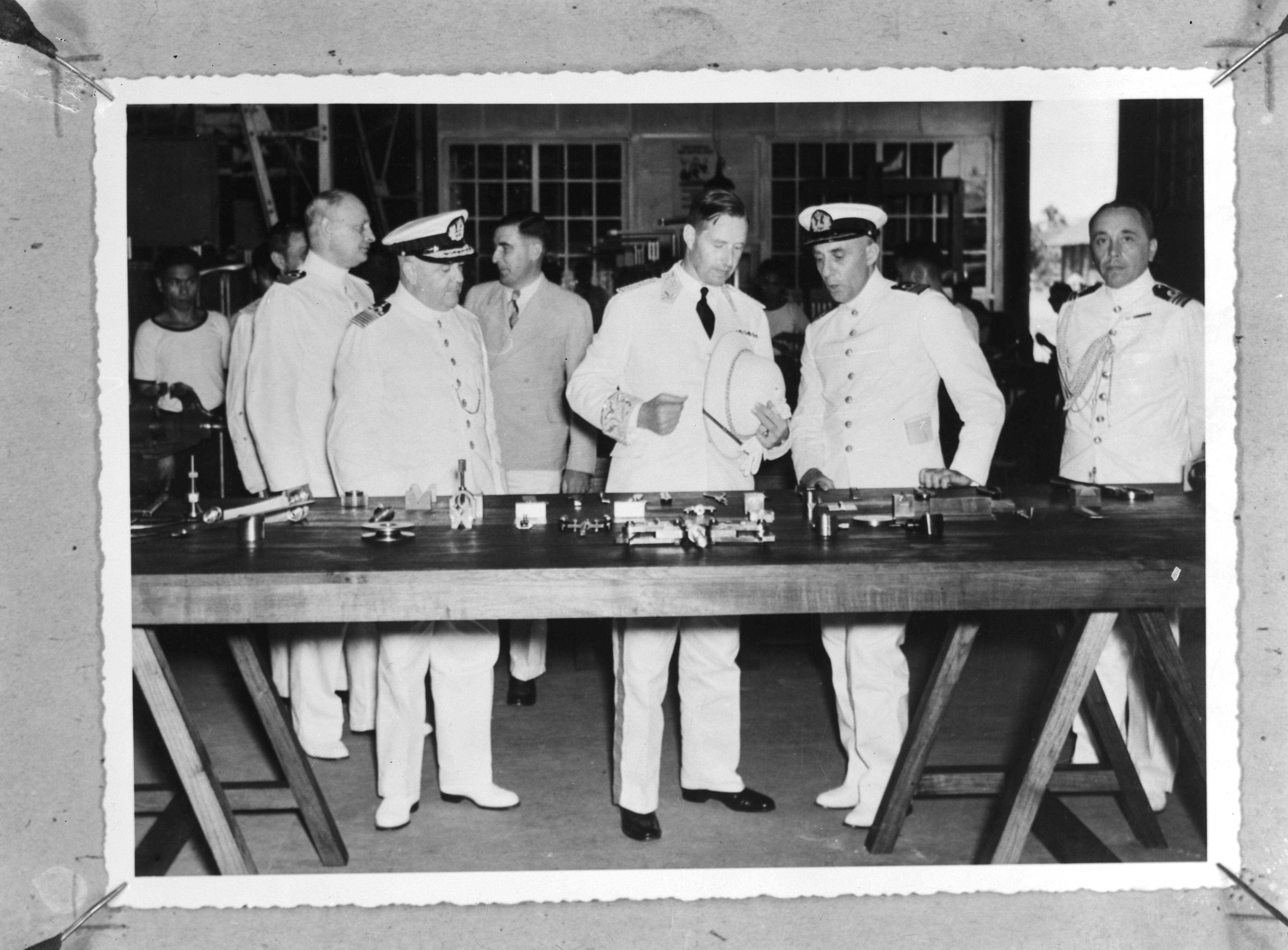 Inspectie Marinebasis Soerabaja. In het midden de Gouverneur Generaal van Nederland Indië Jhr.mr.A.W.L. Tjarda van Starkenborch Stachouwer en rechts de commandant van het Marinevliegkamp Morokrembangan te Soerabaja, kapitein-luitenant ter zee P.J. Hendrikse. Links vooraan vice admiraal C.E.L. Helfrich