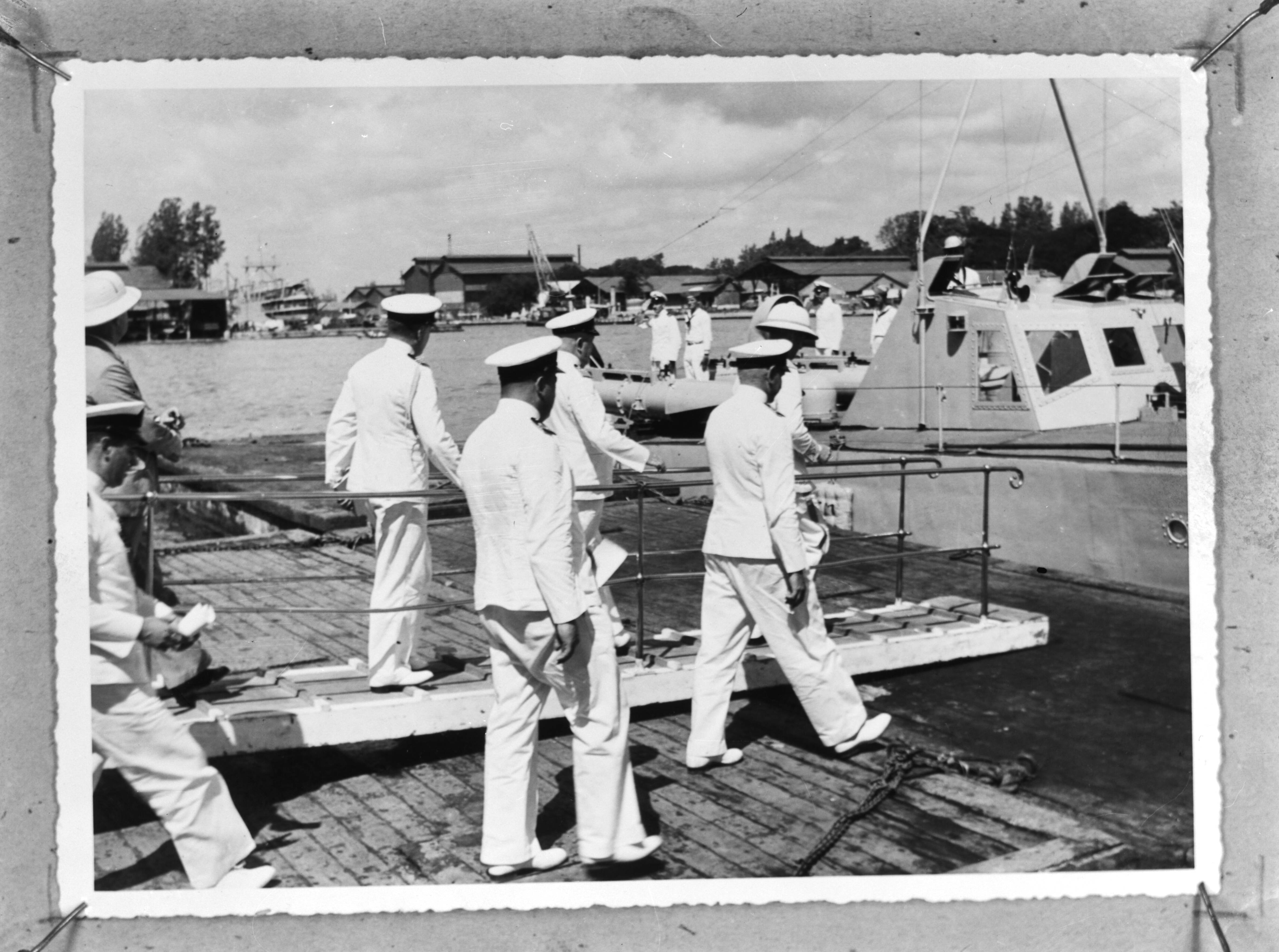 Bezoek van de ministers Welter (Koloniën) en van Kleffens (Buitenlandse Zaken) aan de marine installaties te Soerabaja, vaart met een torpedomotorboot naar het tegenover Soerabaja gelegen eiland Madoera waar de marine de Pyrotechnische werkplaats had gevestigd