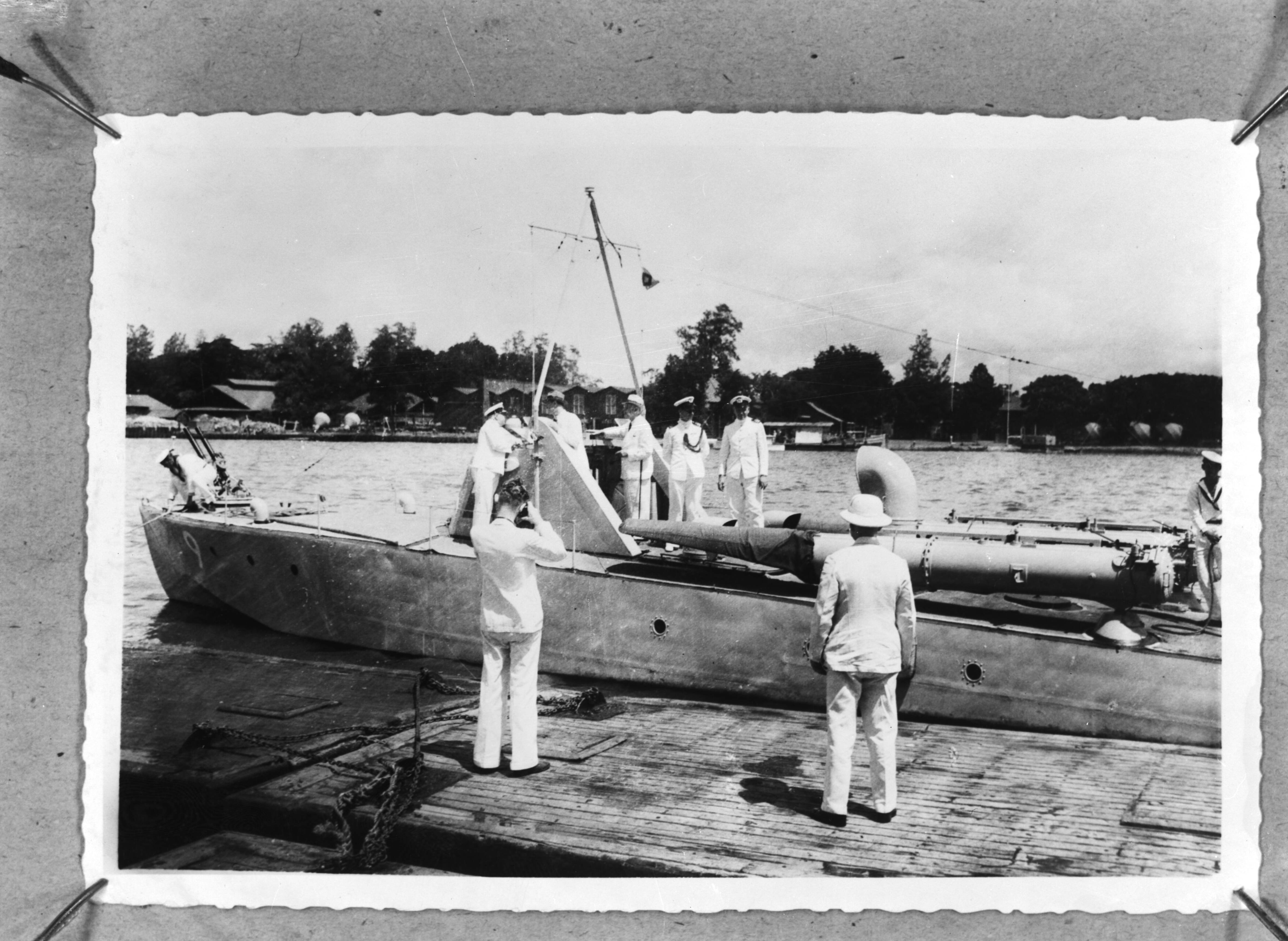 Bezoek van de ministers Welter (Koloniën) en van Kleffens (Buitenlandse Zaken) aan de marine installaties te Soerabaja, na een vaart met een torpedomotorboot naar het tegenover Soerabaja gelegen eiland Madoera waar de marine de Pyrotechnische werkplaats had gevestigd