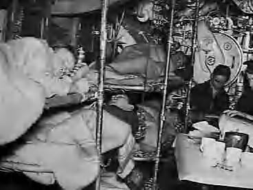 Aan boord van een Nederlandse onderzeeboot. Een deel van de bemanning slaapt in opvouwbare slaapbunkers bij de torpedobuizen