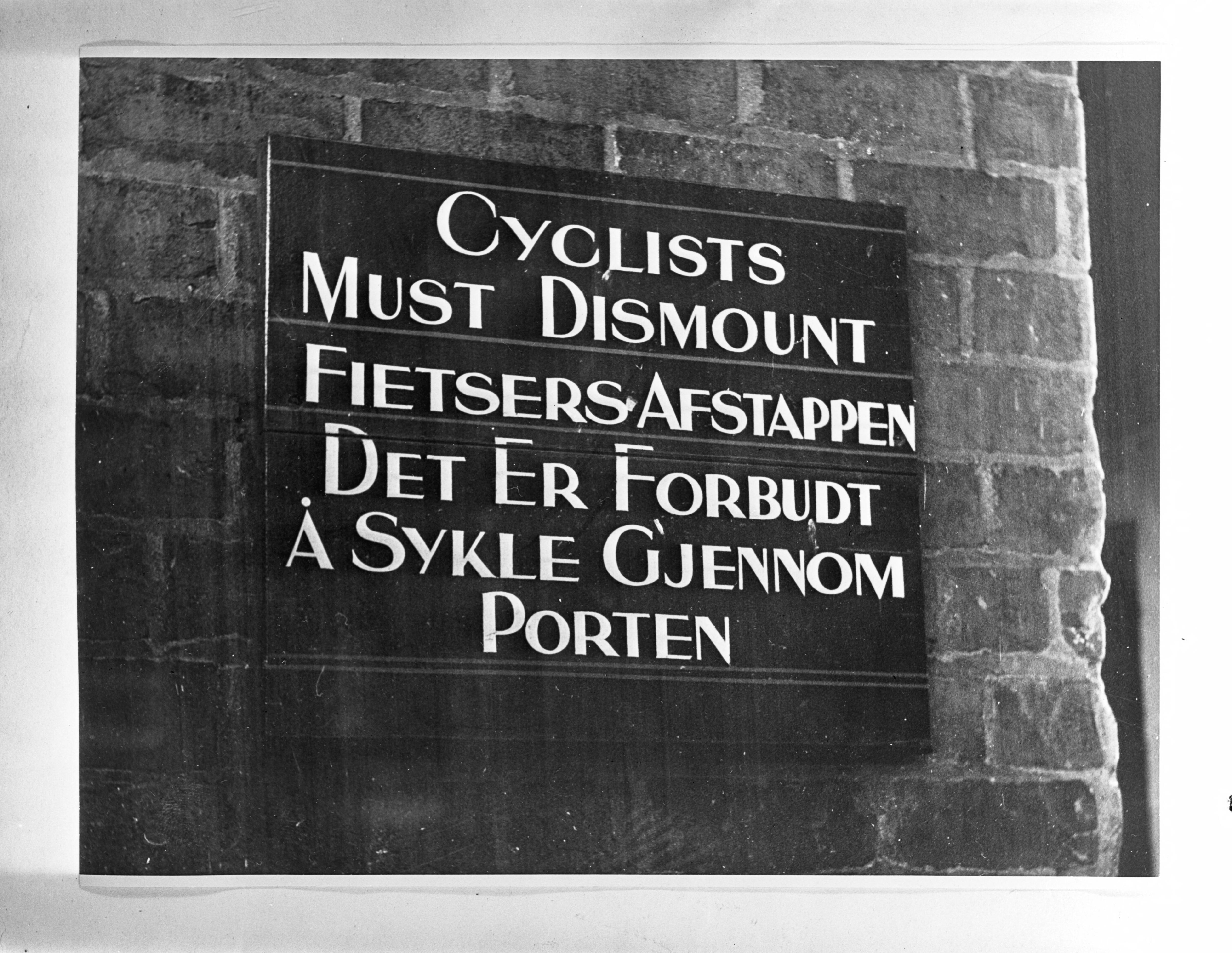 Bord in Londen in drie talen "Cyclist must dismount/ Fietsers afstappen / De Er Forbide a sykle gjennom porten"