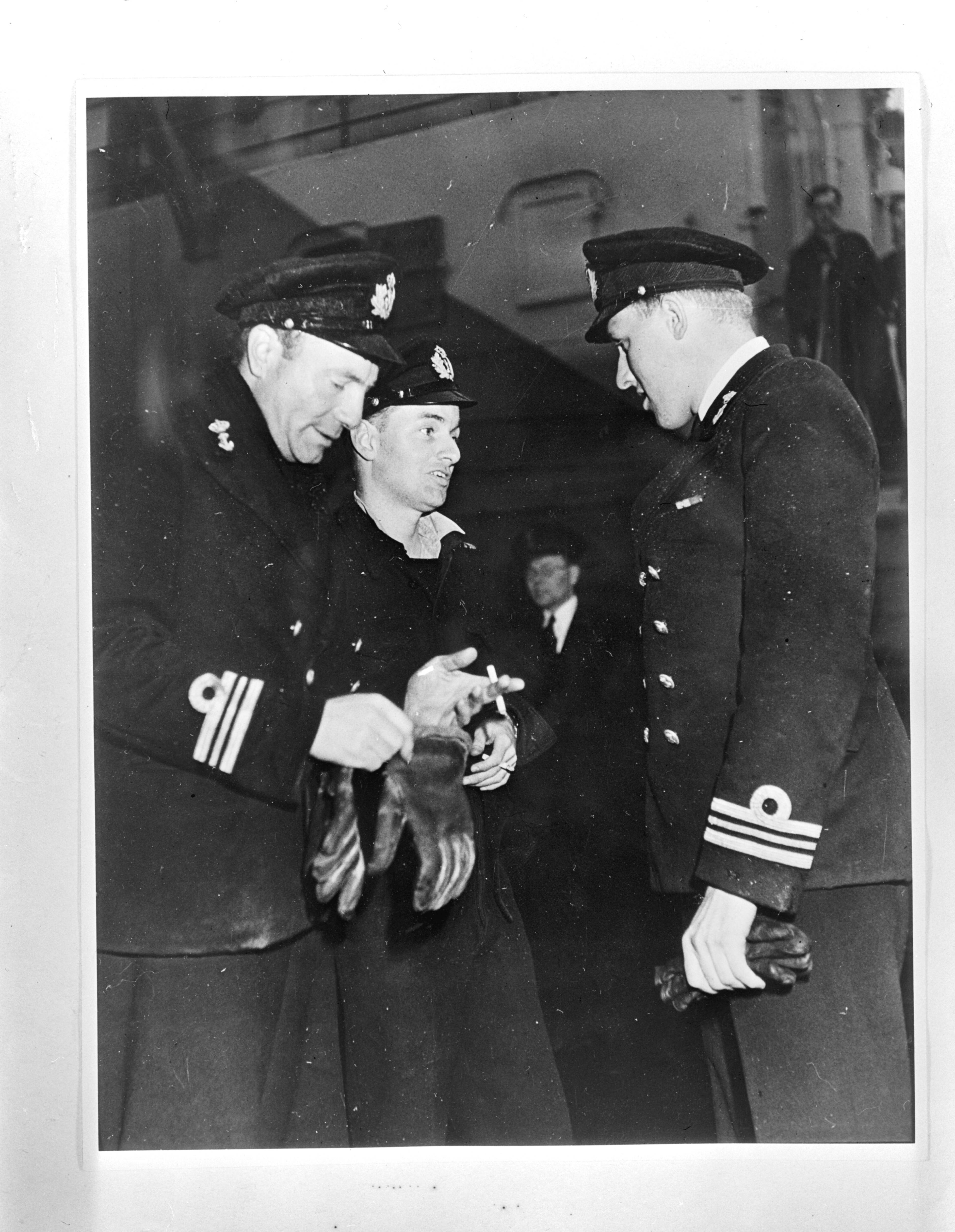 De commandanten van de onderzeeboten "Dolfijn" (H. van Oostrom Soede, rechts) en "O19" (A. van Karnebeek, links) ontmoeten elkaar
