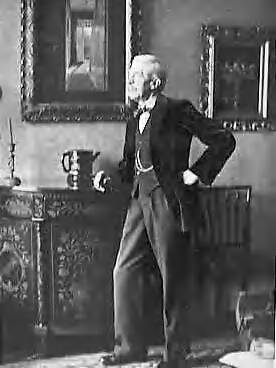 De in Engeland wonende kunstschilder A. van Anrooy poseert in zijn eetkamer met Nederlandse meubels. Aan de muur een afbeelding van het interieur van zijn vorige Londense woning in Malborough Place