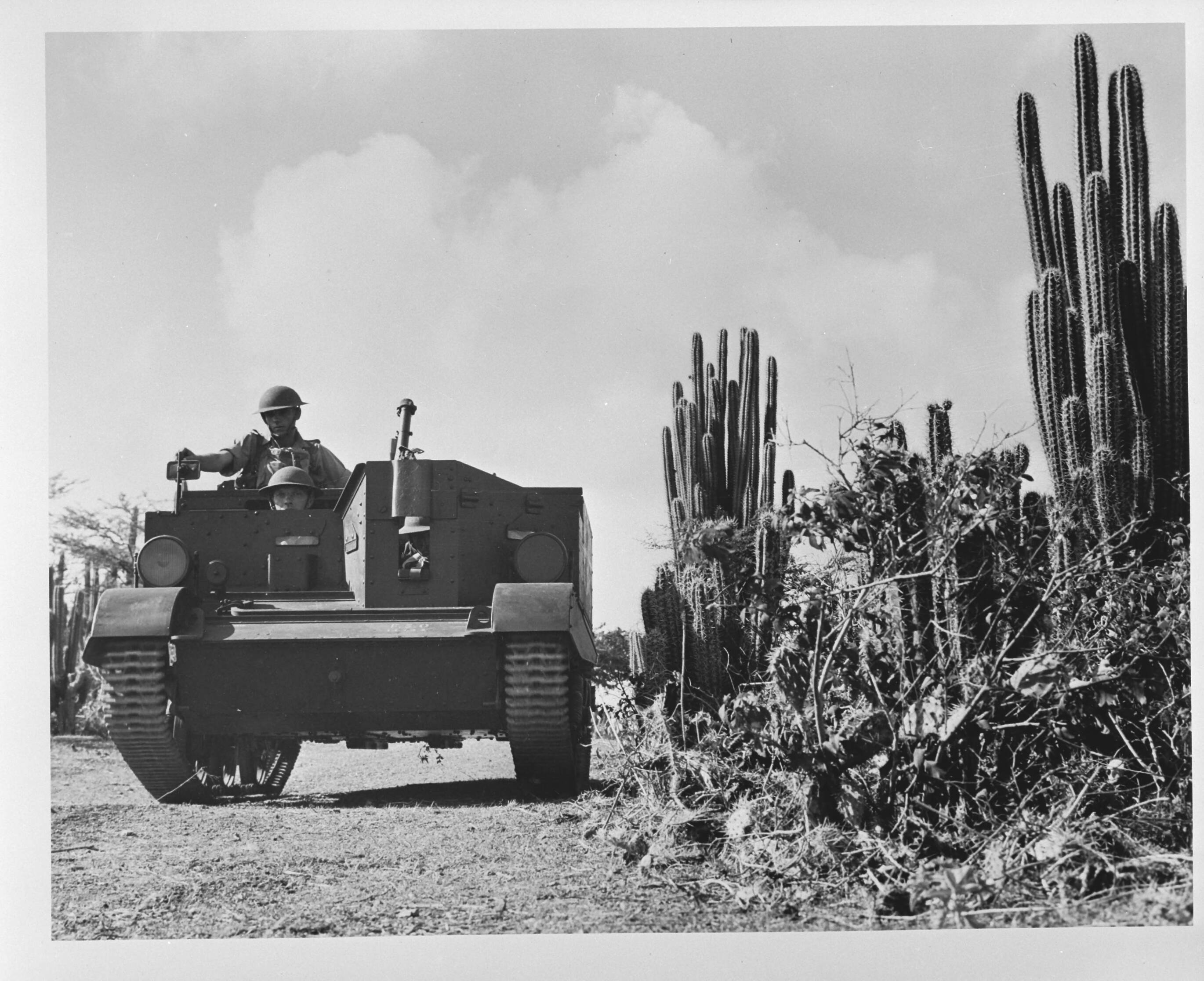 Curaçao. Het Engelse regiment de King's Shropshire Light Infantry tijdens oefeningen bij Suffisant. Bren-carrier