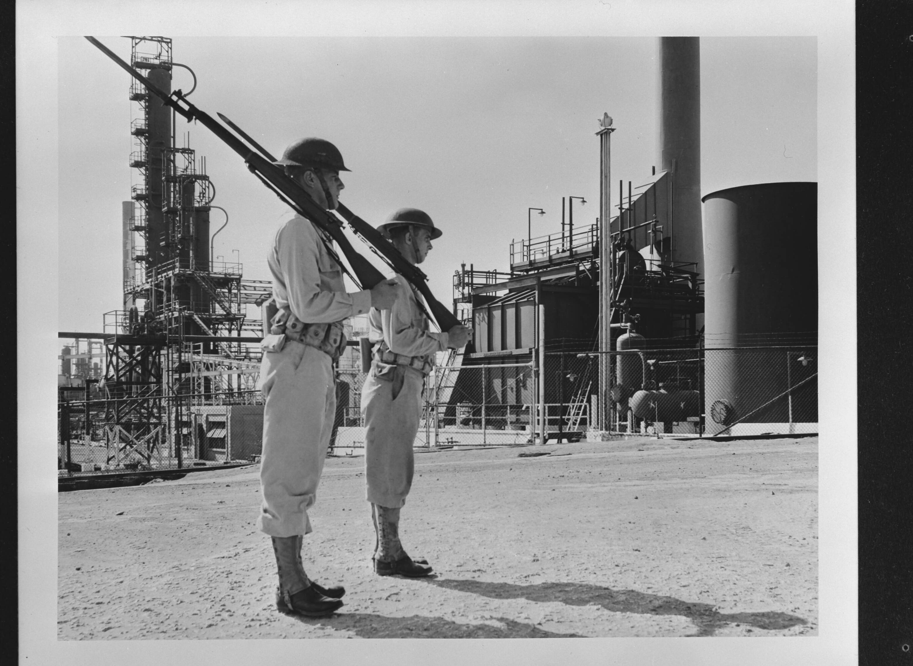 Amerikaanse soldaten op wacht bij de raffinaderij van de Lago Oil and Transport Company te Sint Nicolaas