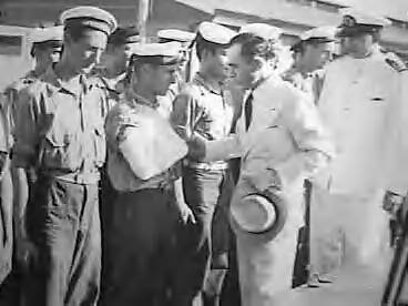 Gouverneur van Curaçao, P.A. Kasteel, bezoekt de Koninklijke Marine n.a.v. de schenking van onderzeebootjager Hr.Ms. 'Queen Wilhelmina' door de Amerikaanse regering. De gouverneur spreekt met een bemanningslid (met een gewonde arm)