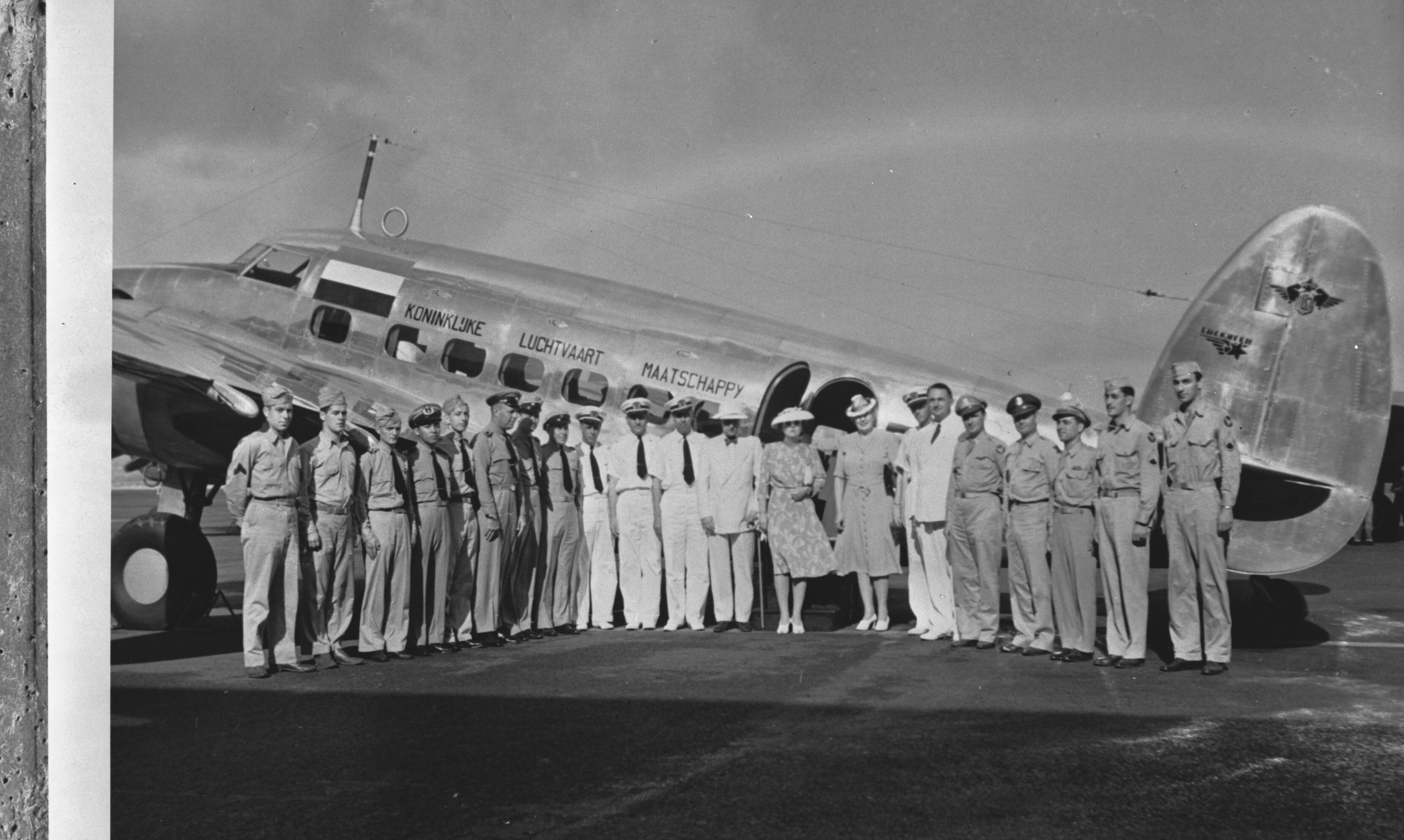 Bezoek van prinses Juliana aan Suriname (1943). De prinses met haar adjudant jhr. A.D.C. van Tets en echtgenote, de bemanning van de Lockheed L14 Super Electra van de KLM en de bemanningen van de Nederlandse en Amerikaanse Mitchell bommenwerpers poserem op de luchthaven