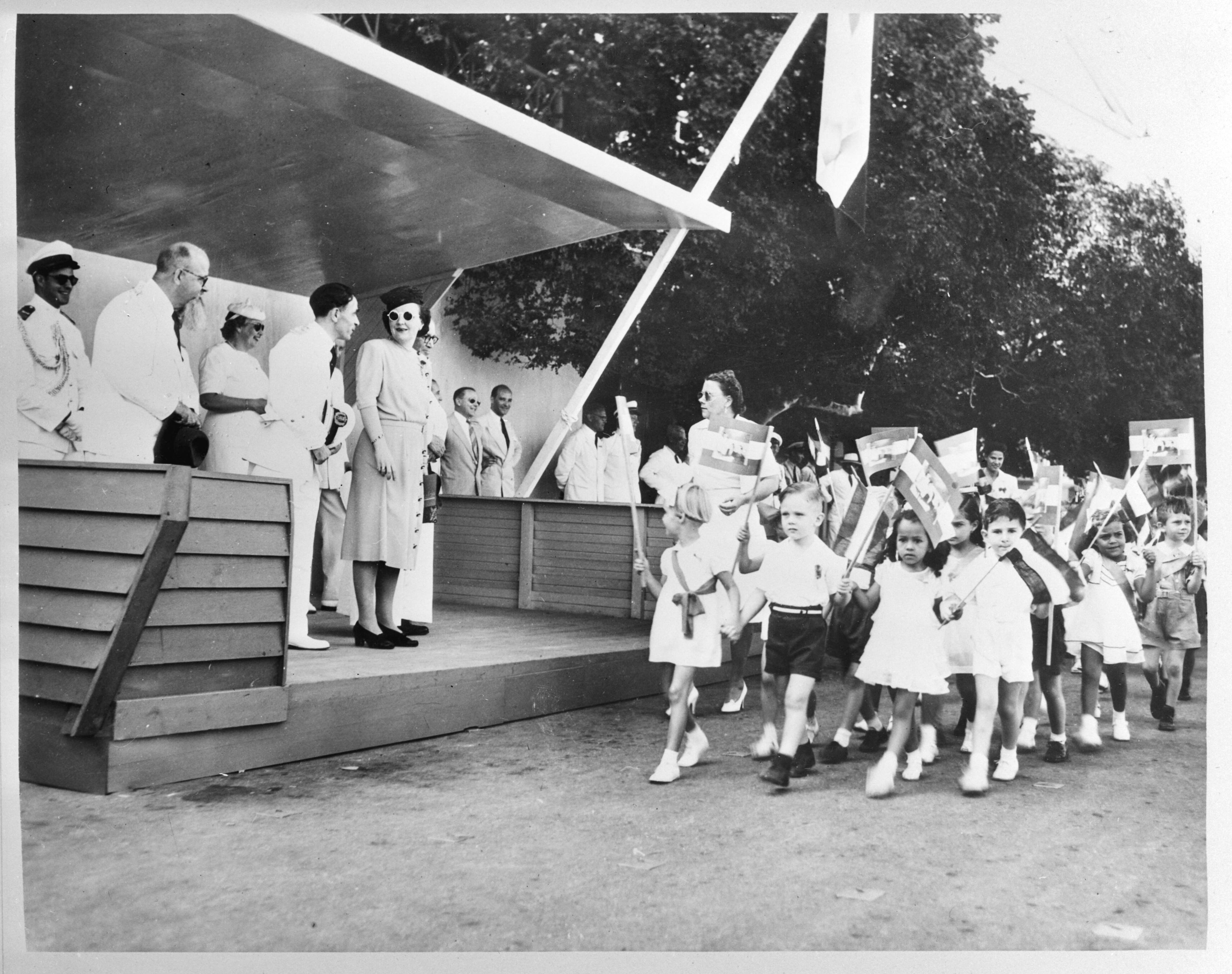 Bezoek van prinses Juliana aan West-Indië (februari-maart 1944). Curaçao. Kinderen hebben gezongen voor de prinses en paraderen nu voor haar