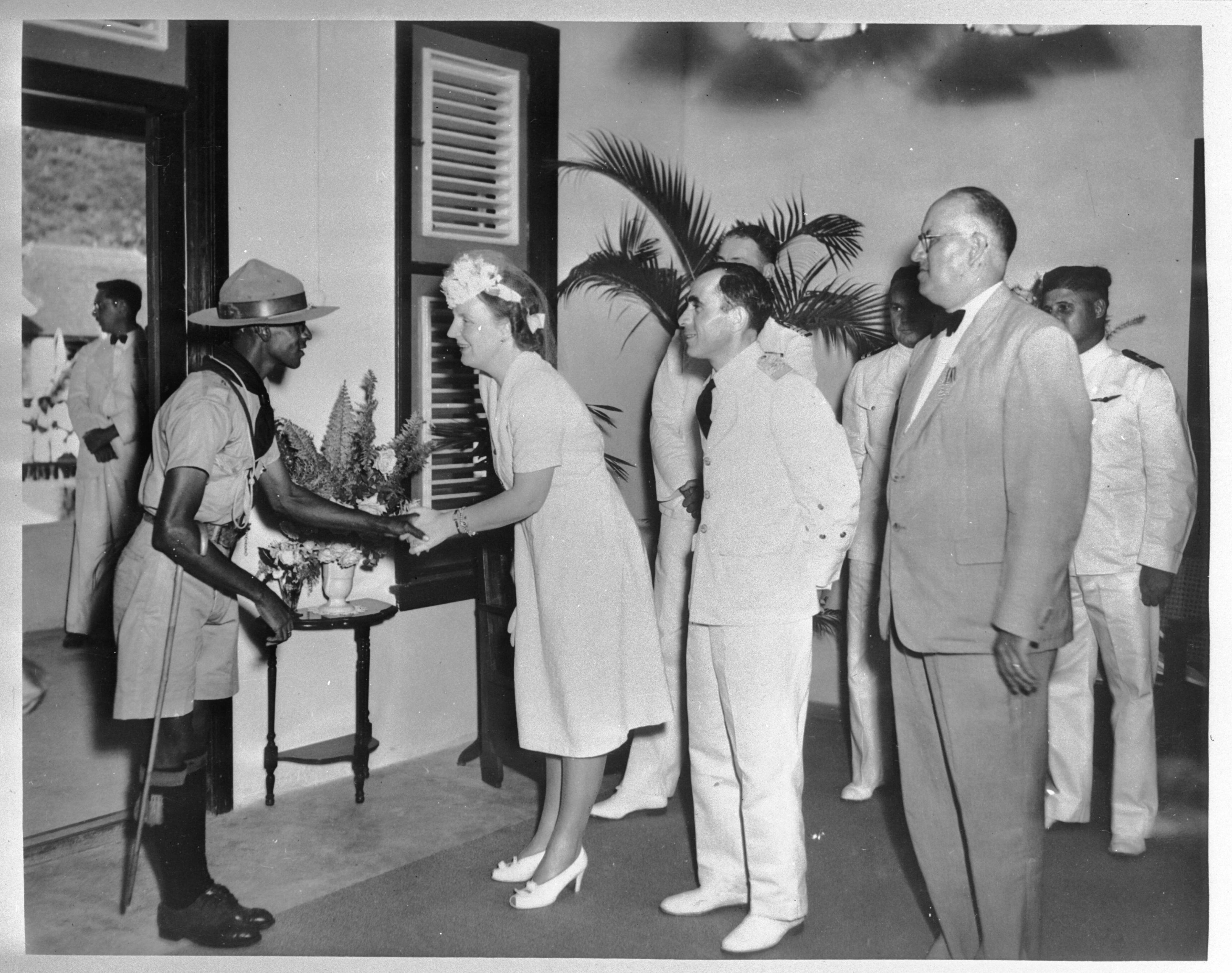 Bezoek van prinses Juliana aan West-Indië (februari-maart 1944). St. Maarten. De prinses schudt tijdens een ontvangst de hand van een hopman van de plaatselijke padvinders. Naast haar gouverneur Kasteel, uiterst rechts gezaghebber P.H. van Leeuwen