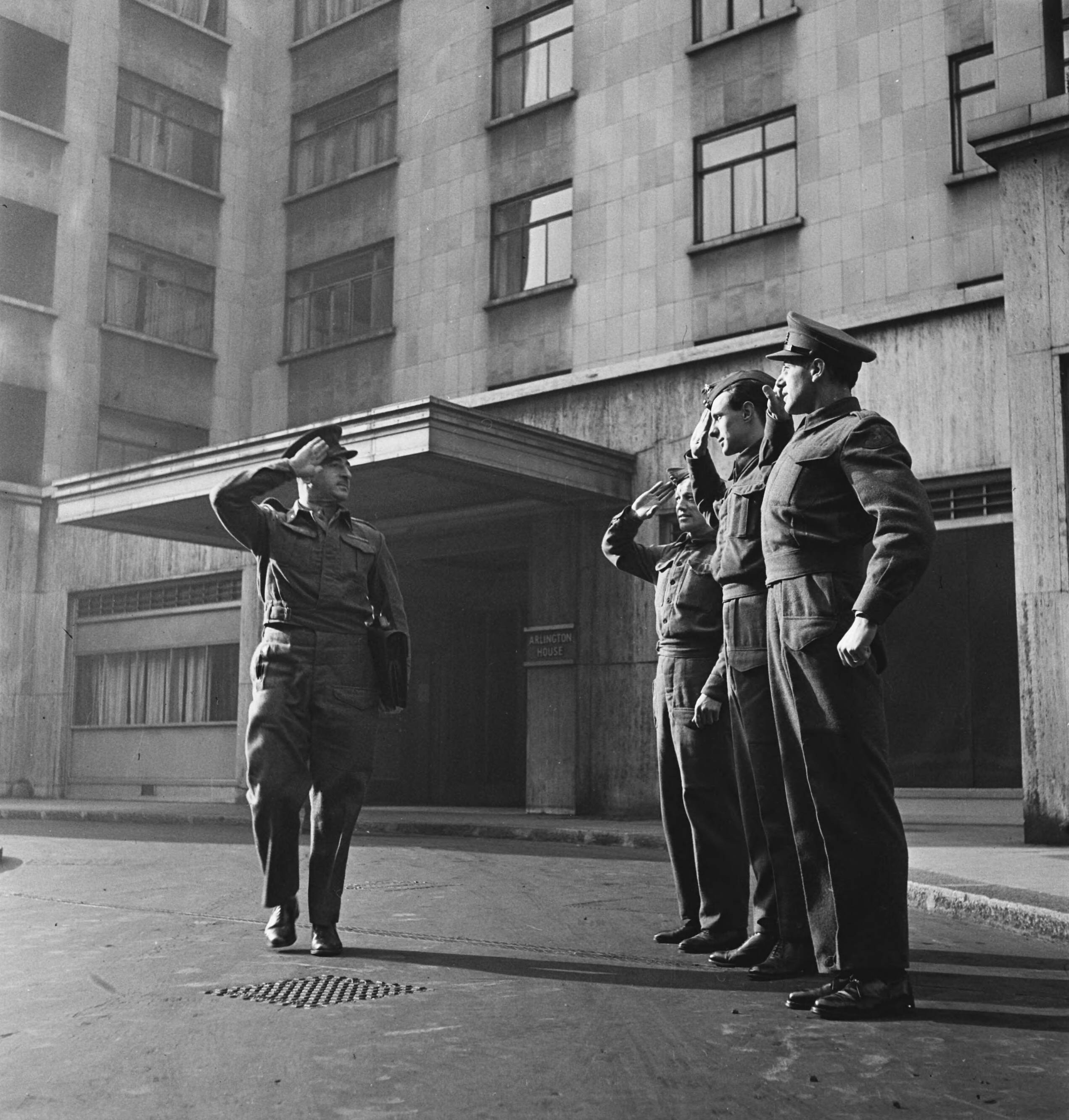 Arlington House Londen een officier met aktetas groet een aantal manschappen
