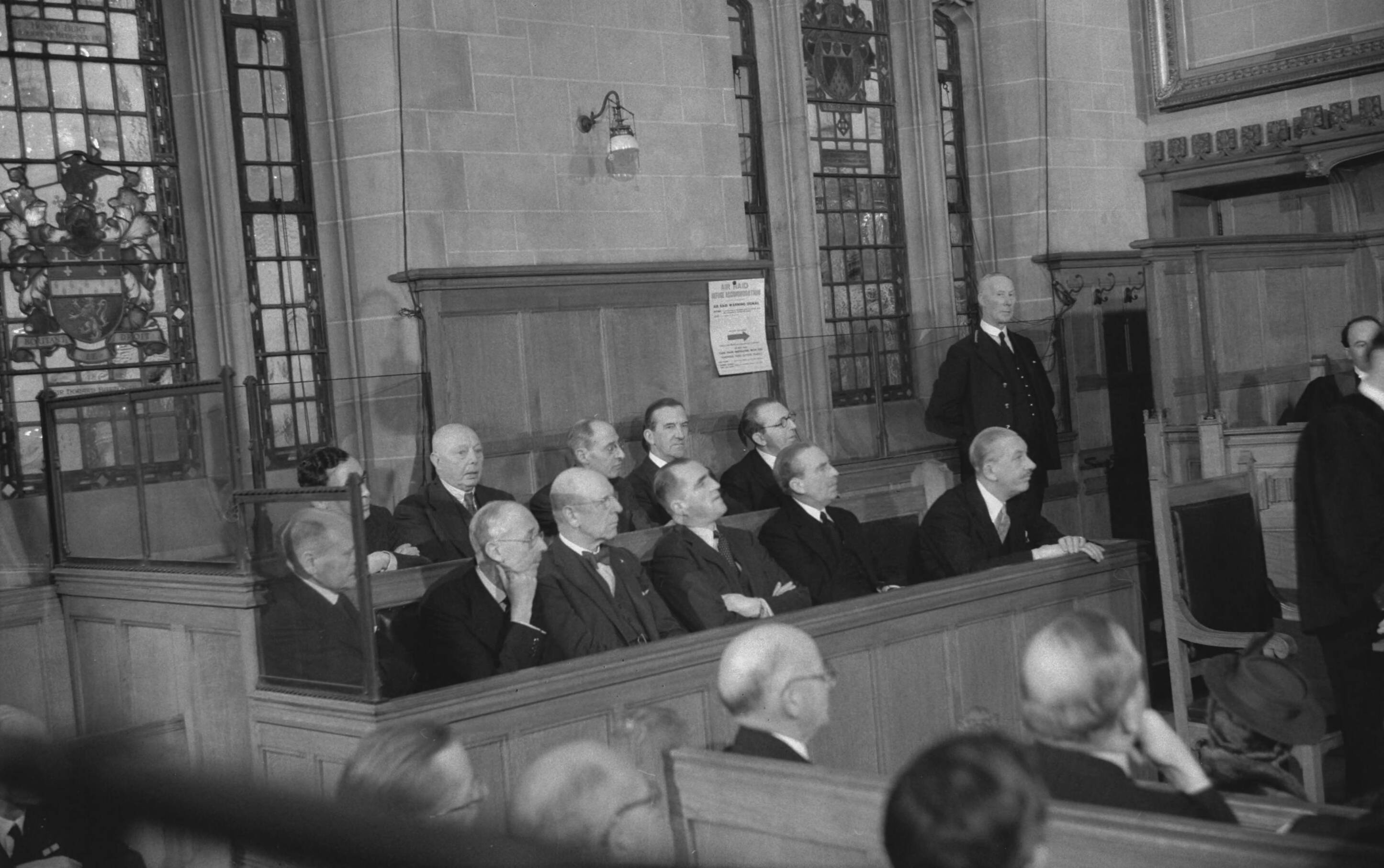 Installatie van het Nederlands Maritiem Gerechtshof in Middlesex Guildhall te Londen, door minister-president P.S. Gerbrandy, tevens openingszitting. Luisterend gasten in de jurybox. vrnl vooraan: Sir Neville Bland (Engels gezant bij de Nederlandse regering), jhr. Michiels van Verduynen (Nederlands ambassadeur), dr. Steenberghe (minister van Scheepvaart), mr. Albarda (minister van Communicatie) en andere leidende persoonlijkheden uit de Nederlandse kolonie