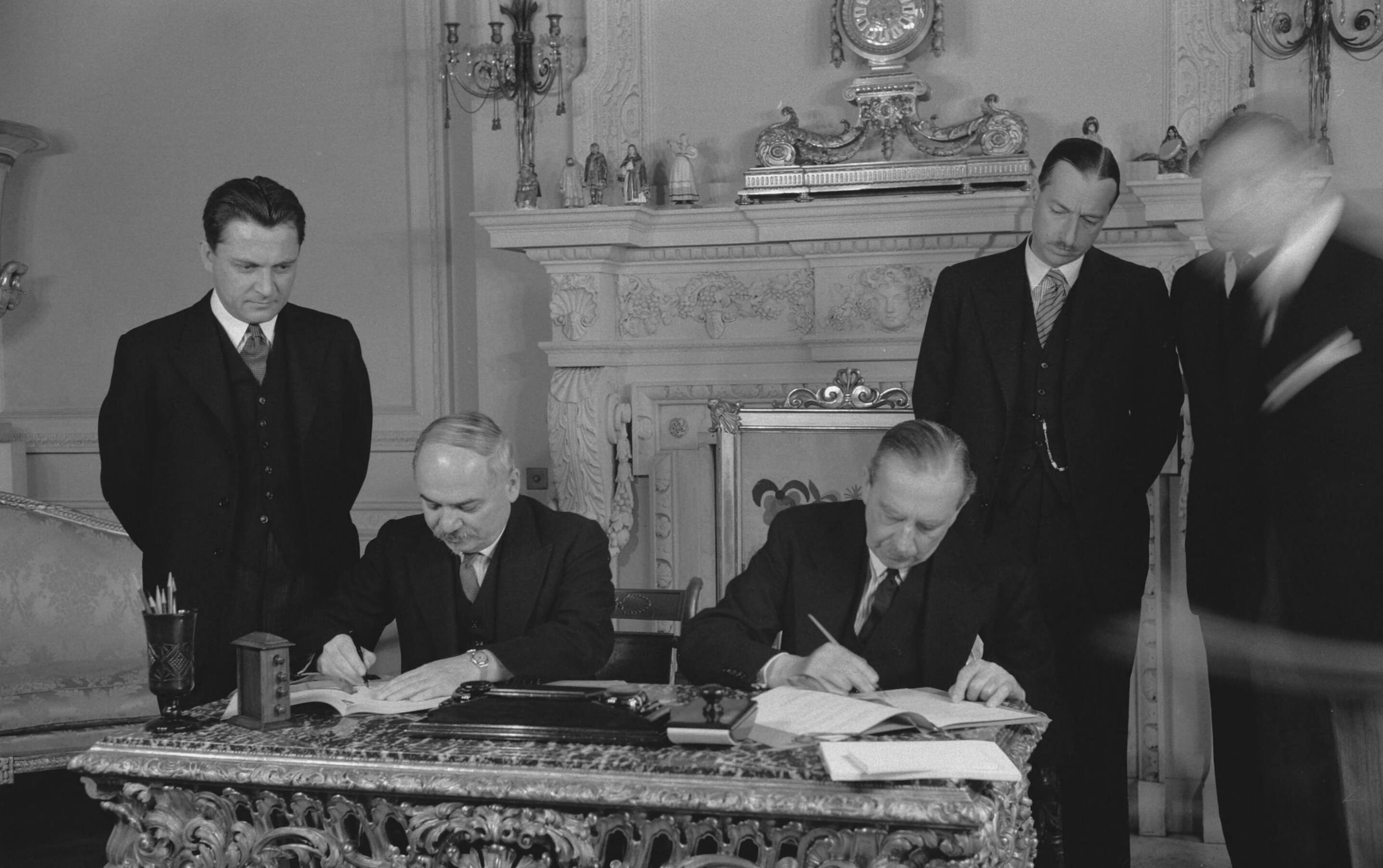 Ondertekening van een overeenkomst tussen Nederland en de Sovjet-Unie op de Russische ambassade te Londen.