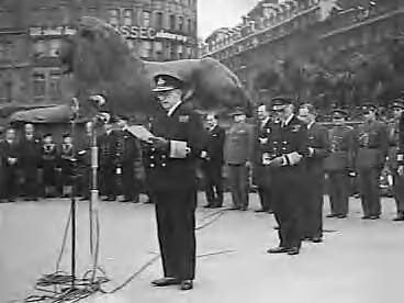 Trafalgar Day ceremonie bij Nelson's Columtnin Trafalgar Square te Londen. First Sea Lord en Admiral of the Fleet sir Dudley Pound leest het gebed geschreven door Nelson voor Trafalgar. Admiraal sir Lionel Halsy staat achter hem