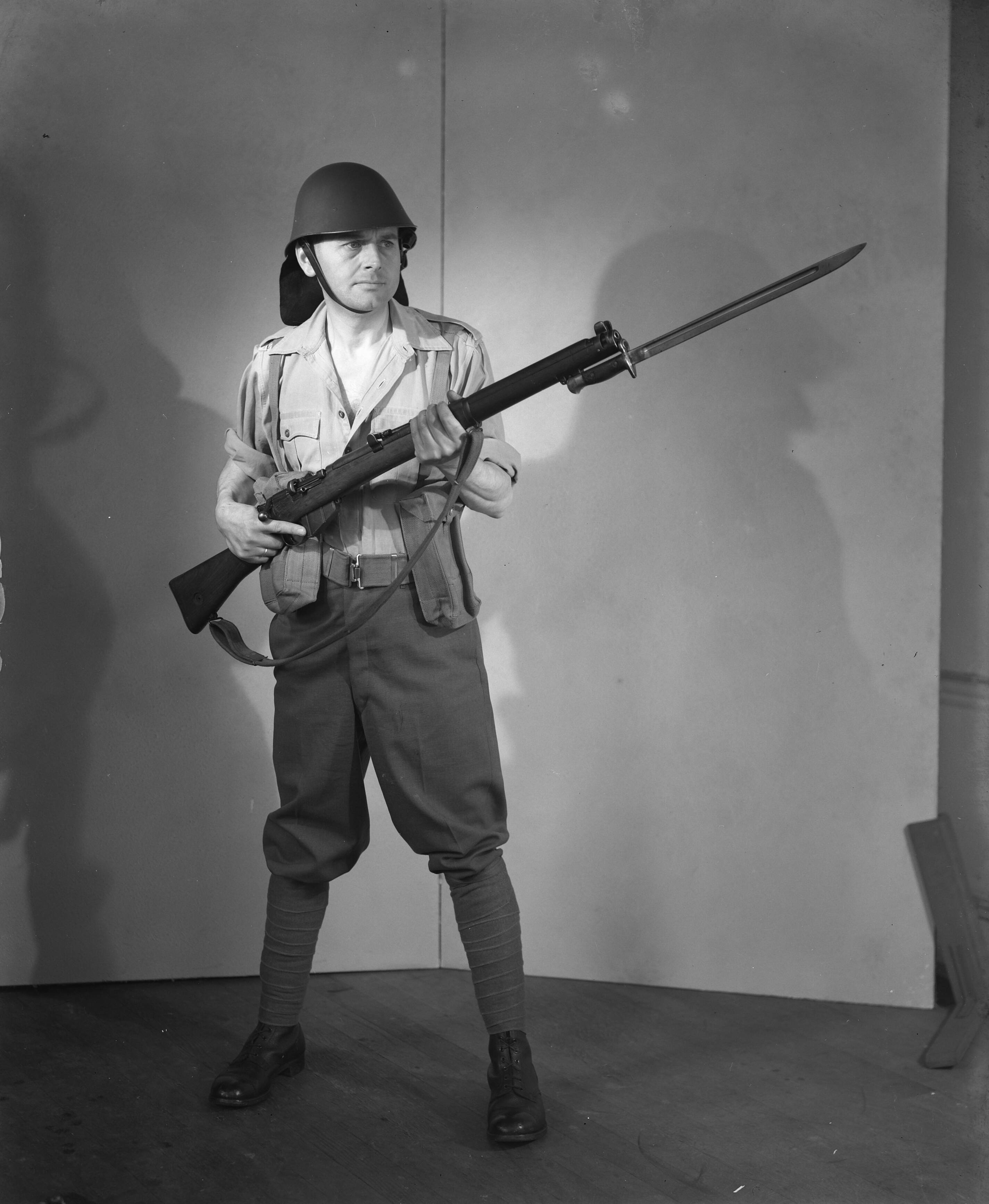serie studiofoto's met man in militaire uitrusting van het KNIL