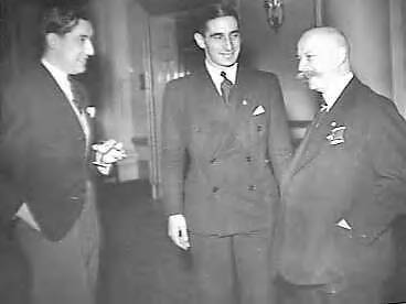 Voetbalwedstrijd tussen een Belgisch en Nederlands team in Londen. Receptie in de Connaught Rooms voor leden van de teams, het erecomité en officiële genodigden. Professor Gerbrandy, de Nederlandse minister-president (rechts), met M. Milhado (voorzitter Nederlandse Sport Organisatie, midden) en de heer Nieuwenhuys (secretaris van de Belgische regering)