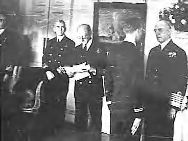 Officieren en manschappen van geallieerde marines gedecoreerd in het Admiralty House. 1 D.S.O, 2 D.S.C.'s en 3 D.S.M.