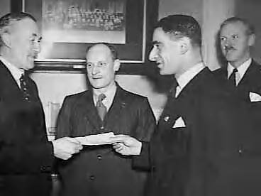 Overhandiging van een cheque van 450 Pond Sterling aan het Rode Kruis, zijnde de opbrengst van de internationale voetbalmatch Nederland-België, aan Lord Wigram (links) door A. Milhado, voorzitter van de Nederlandse Voetbal Bond, Armand Meeuwis, secretaris van de Belgische Voetbal Bond. Rechts op de achtergrond Stanley Rous, secretaris van Engelse Football Association