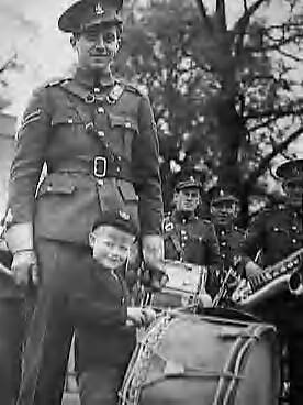 Herdenking invasie door de Duitsers in 1940, georganiseerd door de Netherlands Day of Freedom Committee, te Londen. Evan Williams, een kleine bezoeker uit het zuiden van Wales, mag de grote trom slaan van het muziekkorps van de in Engeland opgerichte Koninklijke Nederlandse Brigade (Prinses Irene Brigade)