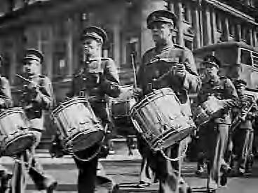 Herdenking invasie door de Duitsers in 1940, georganiseerd door de Netherlands Day of Freedom Committee, te Londen. Het muziekkorps van de in Engeland opgerichte Koninklijke Nederlandse Brigade (Prinses Irene Brigade) marcheert door de straten van Londen