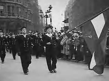Geallieerde "Wings" parade door Londen. Anthony Eden and geallieerde officieren ontvangen saluut op Trafalgar Square. Het Nederlands contingent (Marine Luchtvaart Dienst) marcheert langs Anthony Eden tijdens de "Wings for Victory" parade