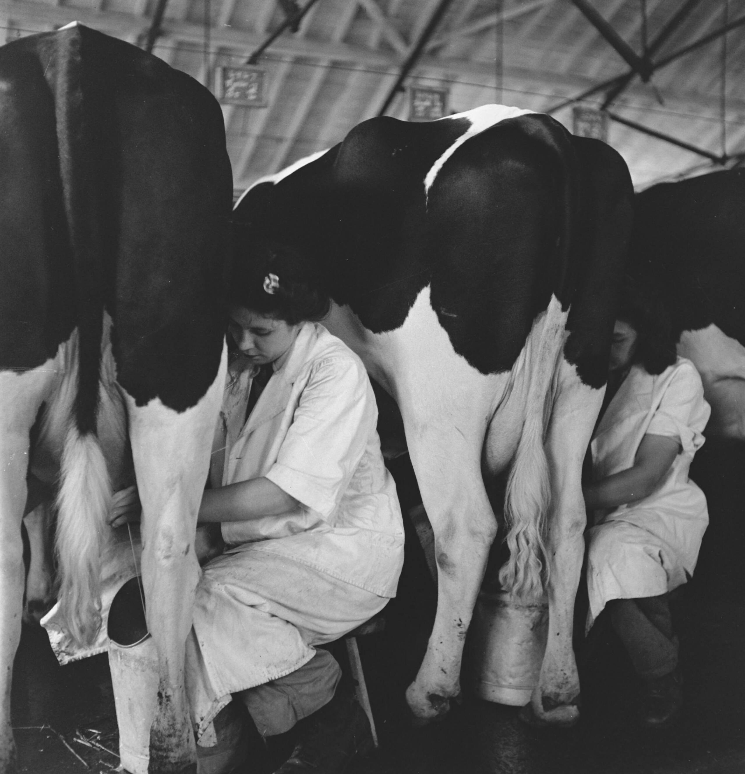 In 1938 Holland had over 1,5 million milk cows, producing on an average 1000 gallons of milk each p.a., with a fat content of 3.56. Many champion cows and bulls have been exported to establish new herds in several countries. The two oldest established herds in England are the Terling and the Lavenham herd, numbering over 1500 head at Lord Ralleigh's farms in Essex. These herds - attested and tuberculin tested - have contained many champions, winning first prizes at dairy shows al over the country. Cows being milked koeien worden gemolken