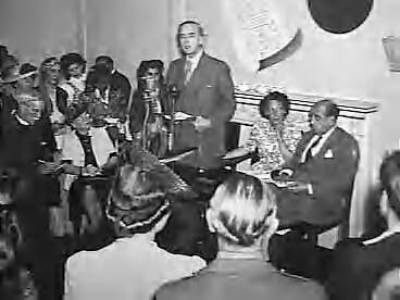 Opening van internationaal jongerencentrum te 30 Pont Street, Londen. Het centrum is bedoeld voor jongeren van de Verenigde Naties en jonge anti-fascisten, zowel militairen, arbeiders en kantoorbedienden. Sir Stafford Cripps verklaart het centrum voor geopend. naast hem zittend mevr. Phyliis Williams (voorzitter van het centrum) en Jan Masaryk (minister van Buitenlandse Zaken van de Tjechoslowaakse regering in ballingschap). Geheel rechts tussen het publiek minister-president Gerbrandy