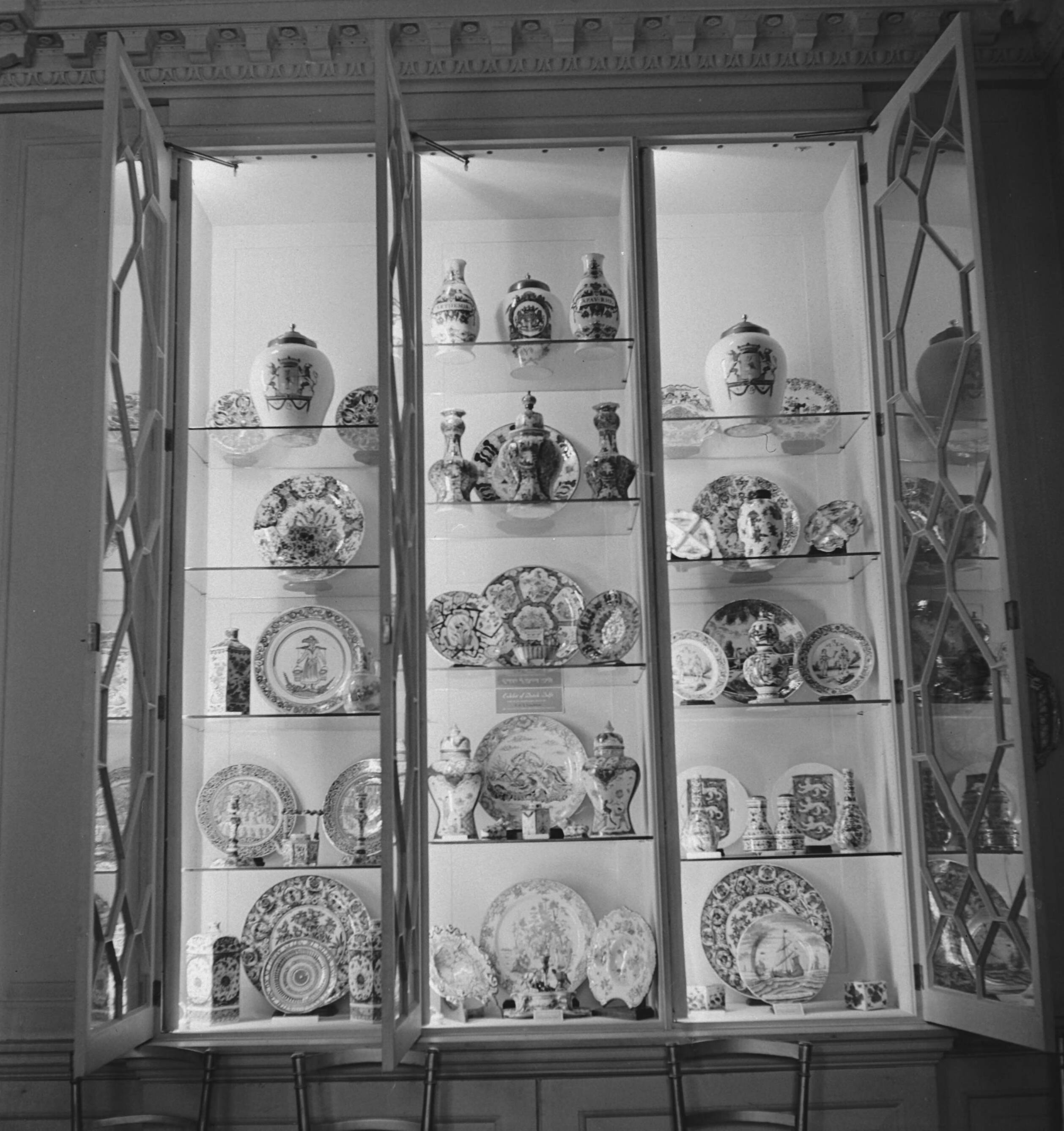 Delft Porcelain, loaned by mr. Vanderkar, exhibited at Netherlands House, Charles Street, London. Tentoonstelling van Delfts aardewerk.