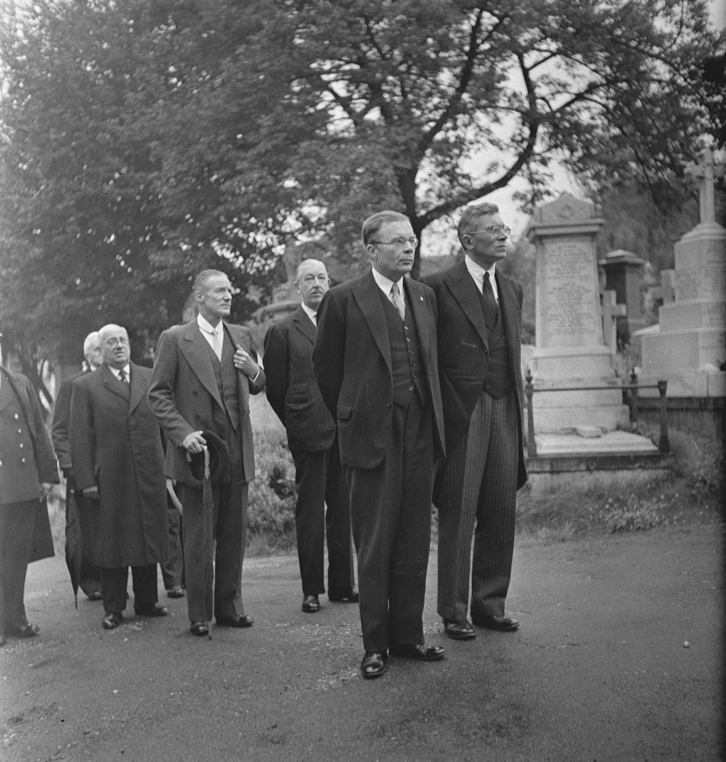 Begrafenis dr. G.H.C. Hart. Links vooraan dr. Van Mook, minister van Koloniën, naast hem dominee Van Dorp. Achter hende Amerikaanse ambassadeur Drexel Biddle en de Britse ambassadeursir Neville Bland. Daarachter de minister van Oorlog O. van Lidth de Jeude.