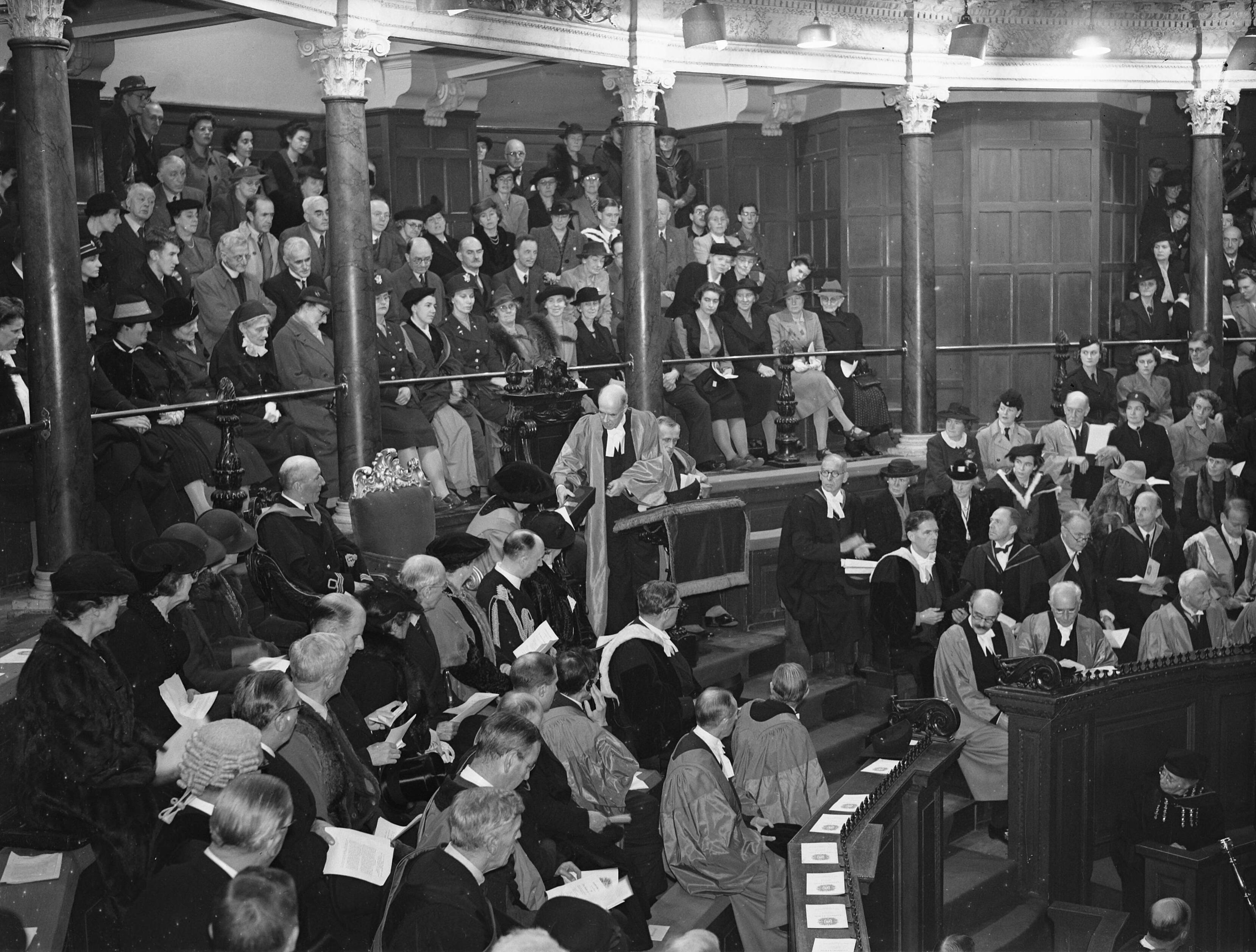 Koningin Wilhelmina ontvangt eredoctoraat van de Universiteit van Oxford. De vice chancellor overhandigt de bul aan de koningin tijdens de ceremonie in het Sheldonian Theatre