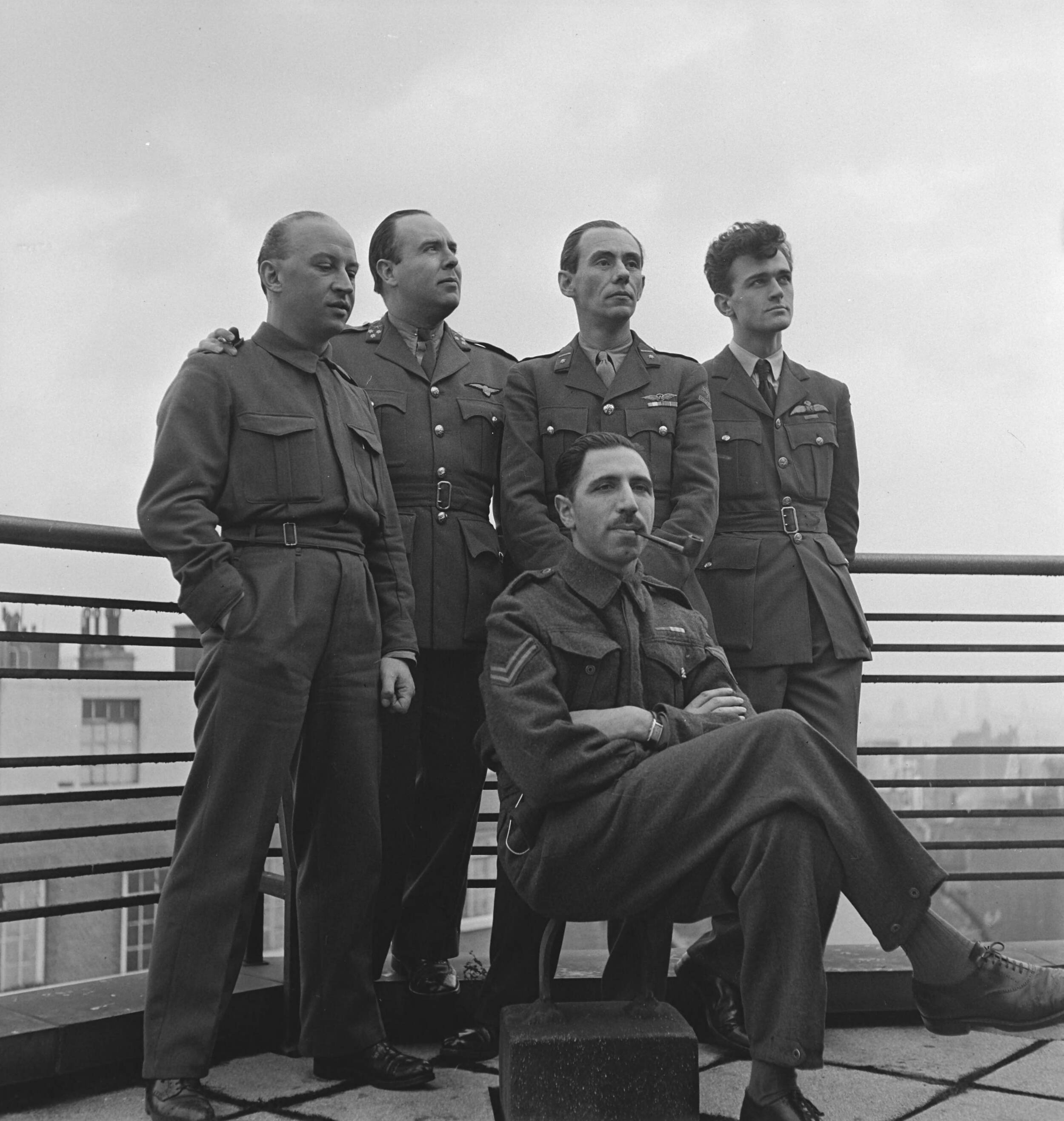 staf van het bureau Luchtvaart, vlnr. onbekend, kapitein dr. ir. M. Kamphuis, majoor ir. Berdenis van Berlekom vlieger, luitenant-vlieger B. Tammes. Zittend korporaal ?