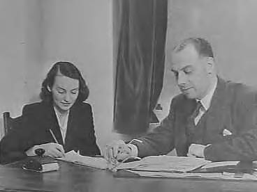 "Vrij Nederland" in Londen. De Algemeen Directeur van de Netherland Publishing Co. Ltd, J. Brandel en zijn secretaresse, miss Sands