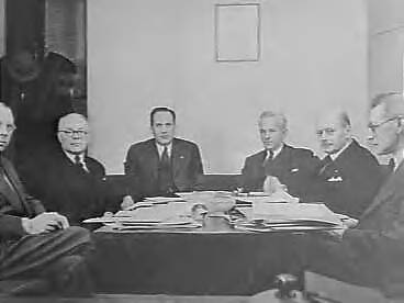 "Vrij Nederland" in Londen. De directieraad van de Netherlands Publishing Company Ltd. Vlnr J. Brandel (General Manager), P. Rijkens (voorzitter van het directie), G.J.L. van der Lande (directeur), J. B. Aug. Kessler (directeur), jhr. F. Beelaerts van Blokland (directeur) en P.C. Duyvesteyn (secretaris)