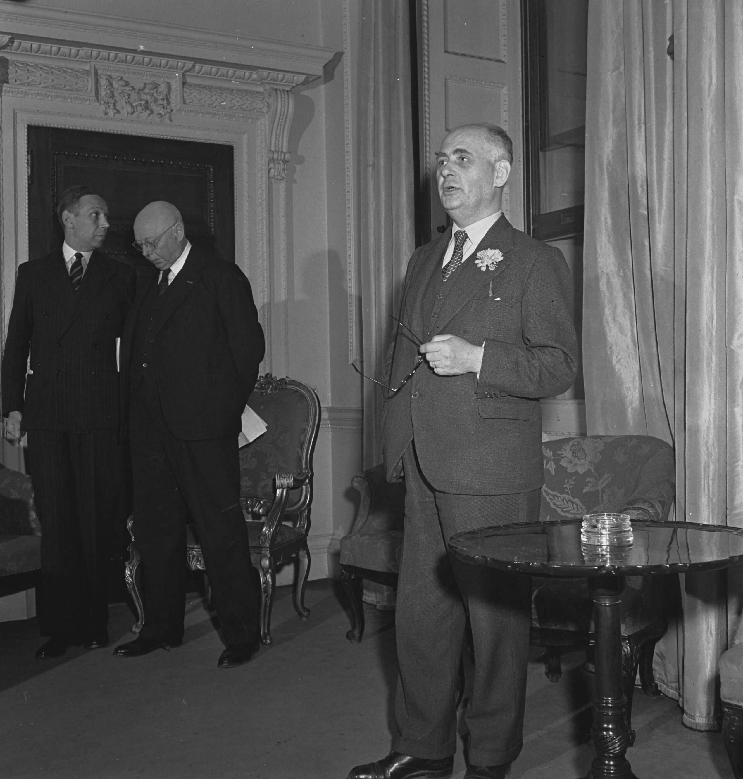 Adriaan Pelt van de Regeeringsvoorlichtingsdienst tijdens een redevoering