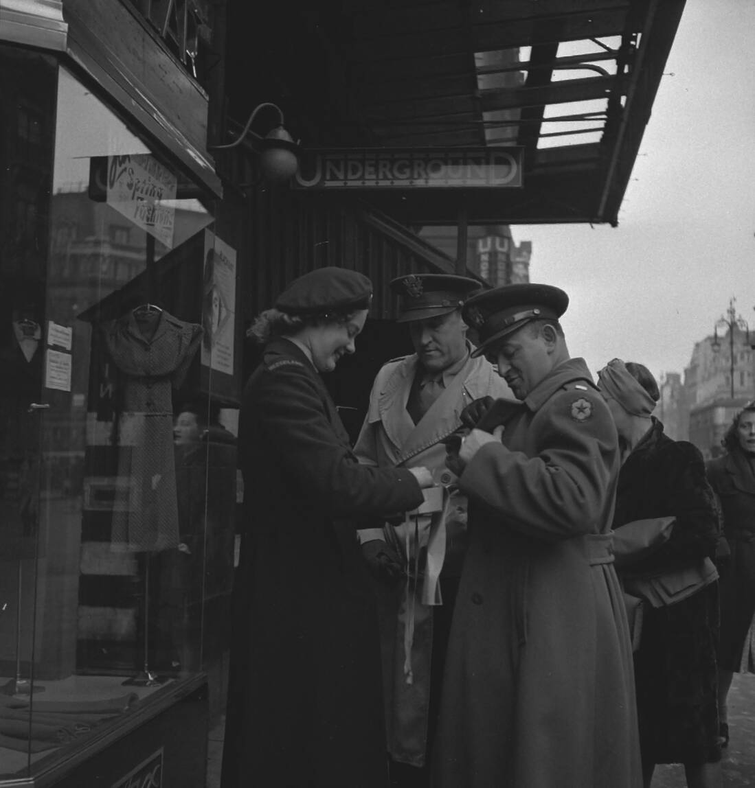 Buitenlandse officieren kopen speldjes van een lid van het Vrouwen hulpkorps