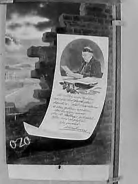 Affiches en pamfletten Tweede Wereldoorlog; foto Willhelmina met tekst in haar handschrift "Wij zullen niet rusten voordat het groote doel bereikt is; dát vaderland te doen geboren worden dat bewijzen moet dat de tallooze gebrachte offers niet vergeefsch zijn geweest. Wilhelmina"