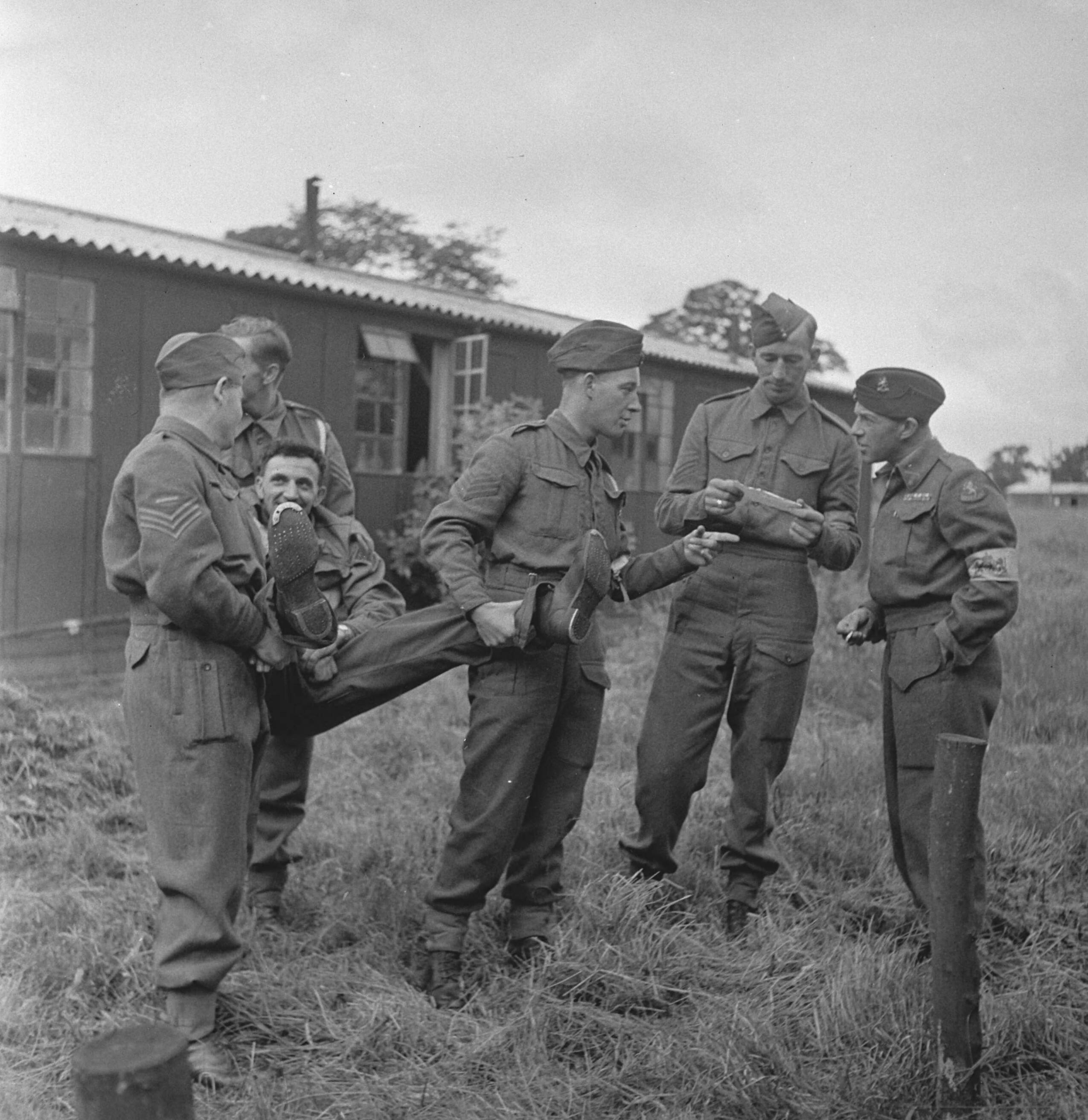 Oefening van frontsecties van het het Militair Gezag en het Vrouwen Hulp Korps in het administreren en toelaten van repatrianten in toekomstig bevrijd gebied. Een Duitser die zich had voorgedaan als een Nederlander wordt over de grens gezet