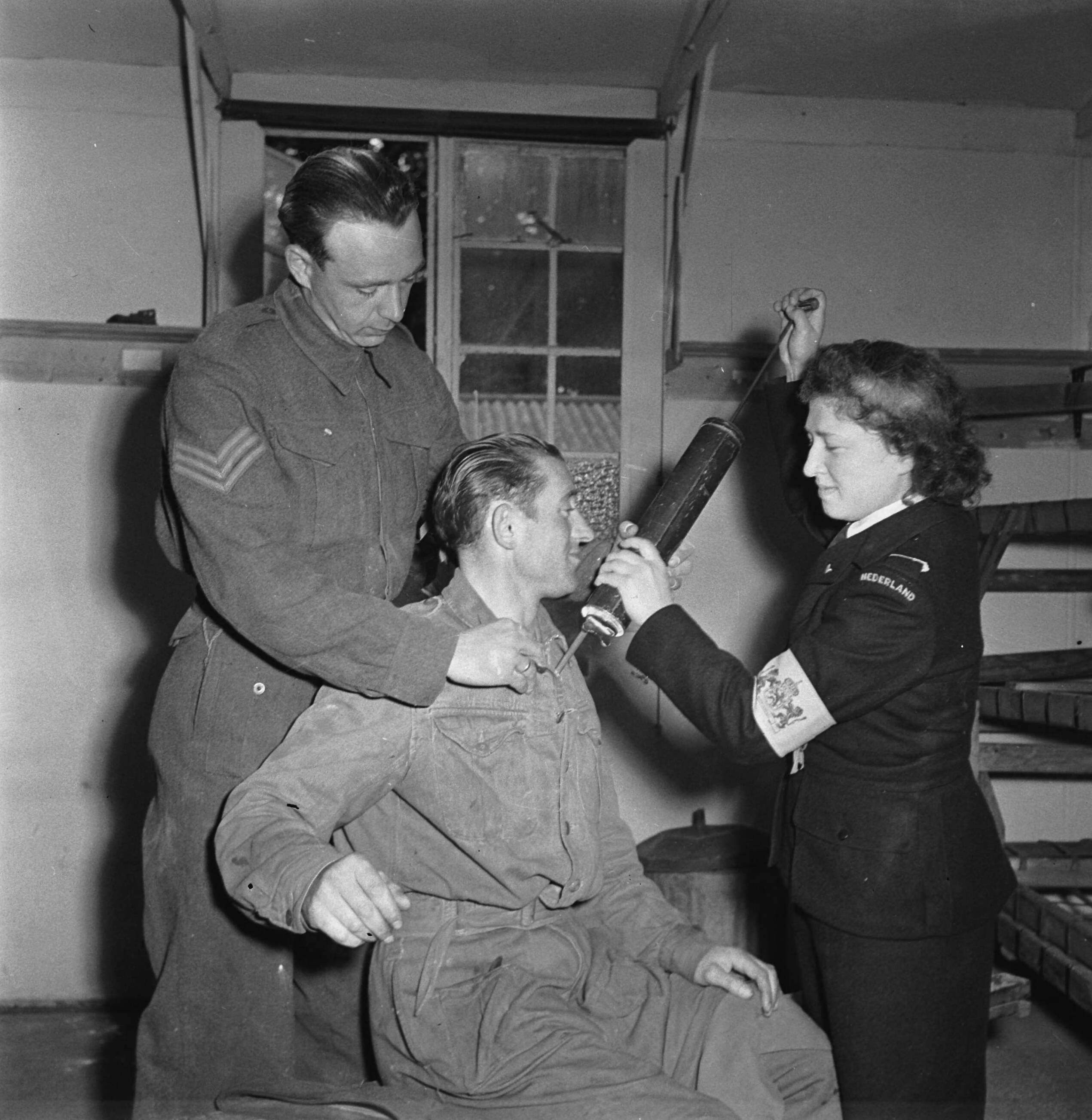 Oefening van frontsecties van het het Militair Gezag en het Vrouwen Hulp Korps in het administreren en toelaten van repatrianten in toekomstig bevrijd gebied. Een flitsspuit met DDT wordt gebruikt bij het desinfecteren om de verspreiding van typhus tegen te gaan