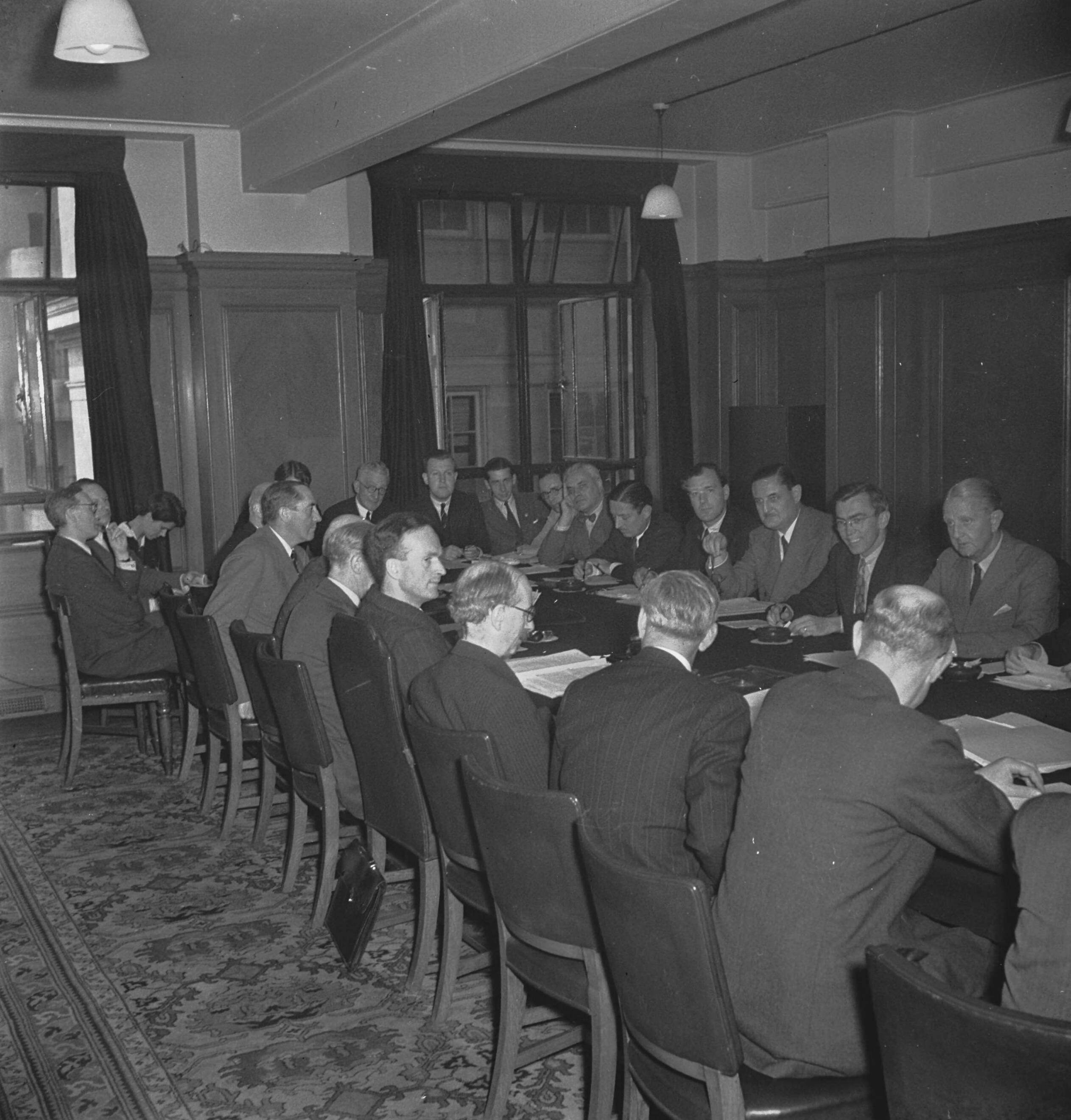 Naoorlogse rubber problemen worden besproken op een conferentie in Londen. De delegatie van Nederland (met gezicht naar camera), derde van rechts E.C. Zimmerman, rechts daarvan P.H. Westermann (hoofd van de delegatie), vervolgens luitenant-kolonel J.T. Cremer, dr. P. Honig, Jhr. Th Röell en J.C. Bottenheim. Links van Zimmerman Collees en Gordon