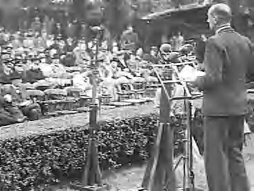 Viering van de 64e verjaardag van koningin Wilhelmina in Regents Park. Toespraak van Van Heuven Goedhart, minister van Justitie
