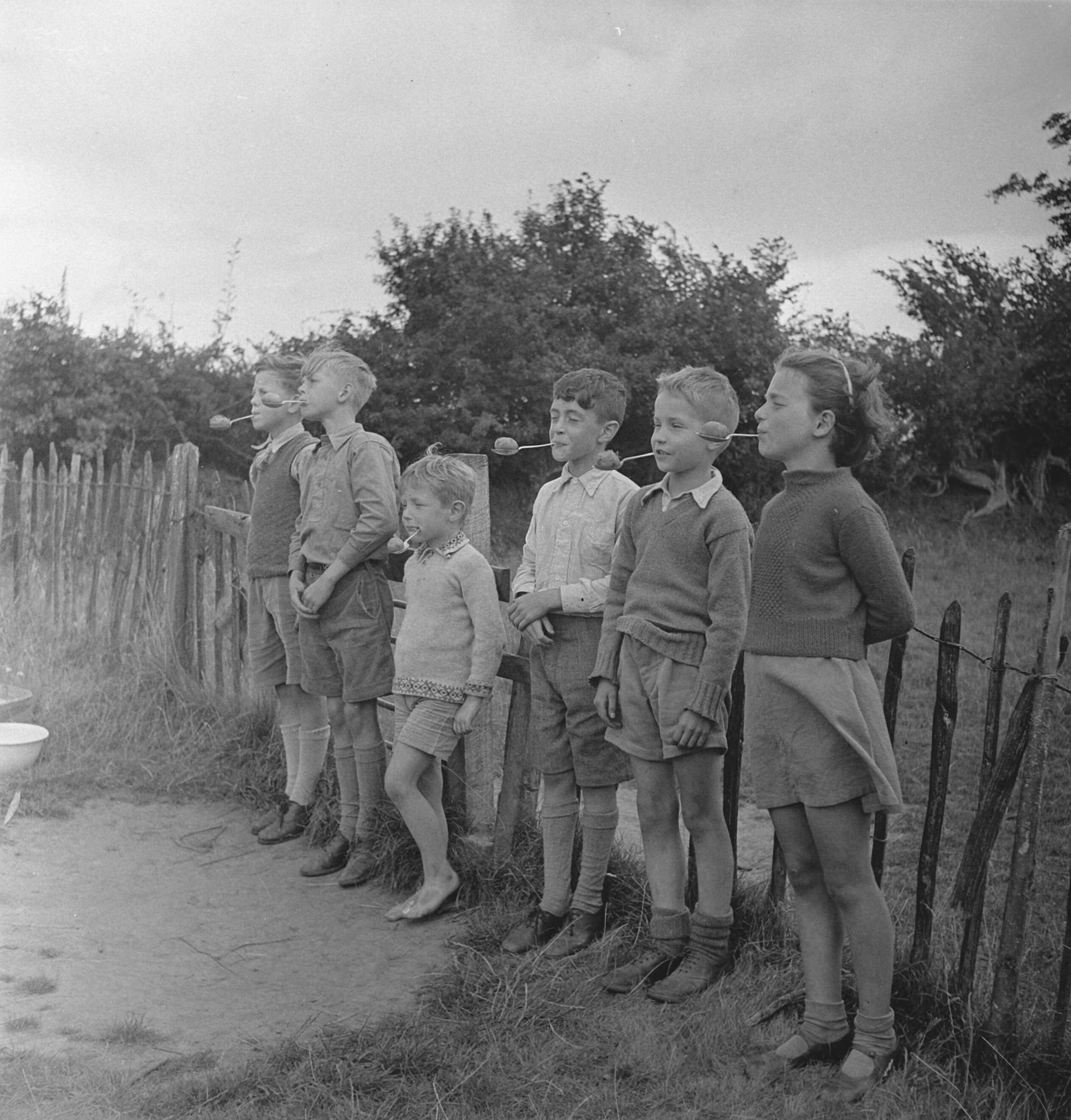 Serie: Nederlandse kinderen op vakantie. Het spelletje 'eieren lopen' met aardappelen op de lepels