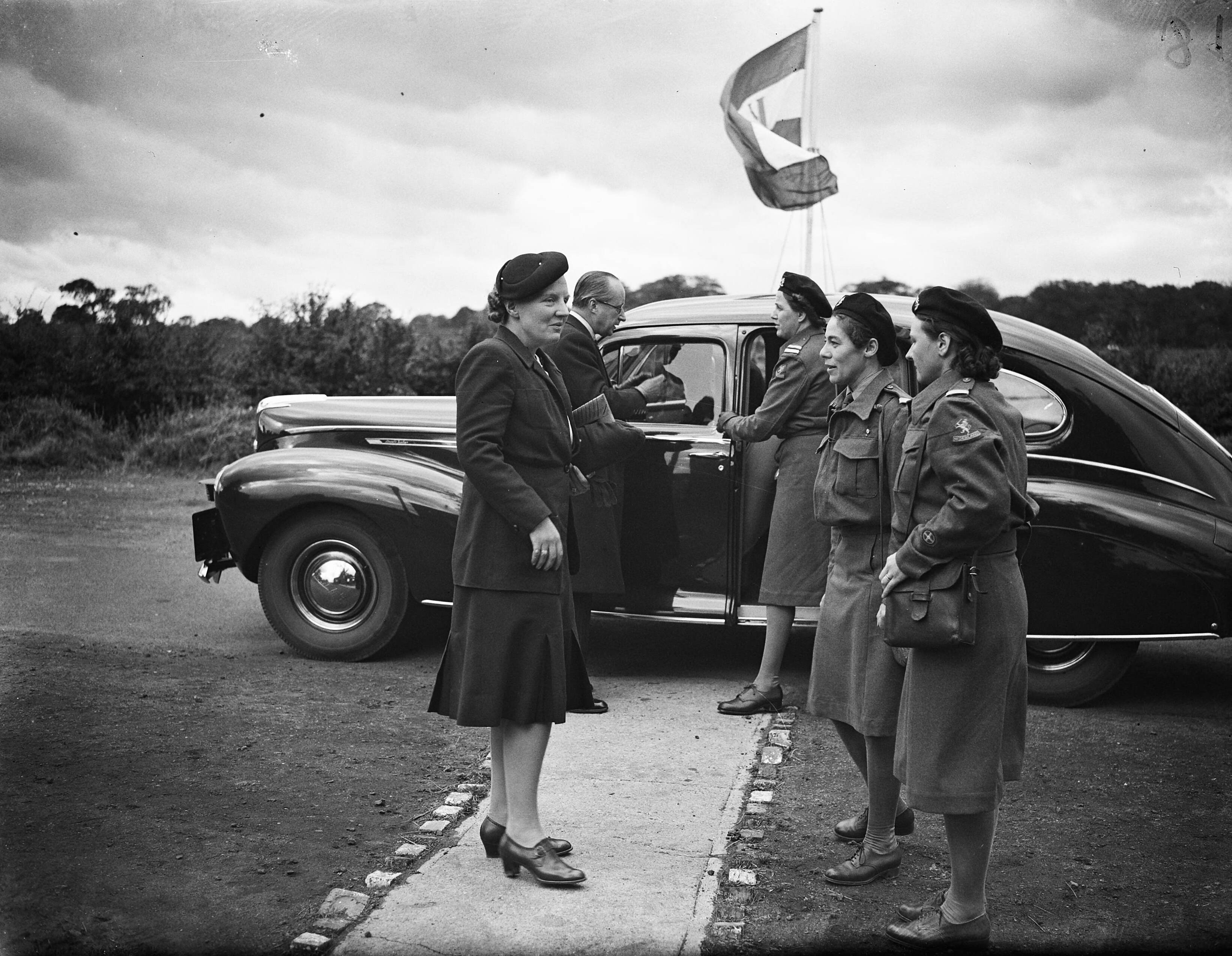 Bezoek van prinses Juliana aan het recent opgerichte Vrouwen Hulp Korps. De prinses wordt ontvangen door de officieren