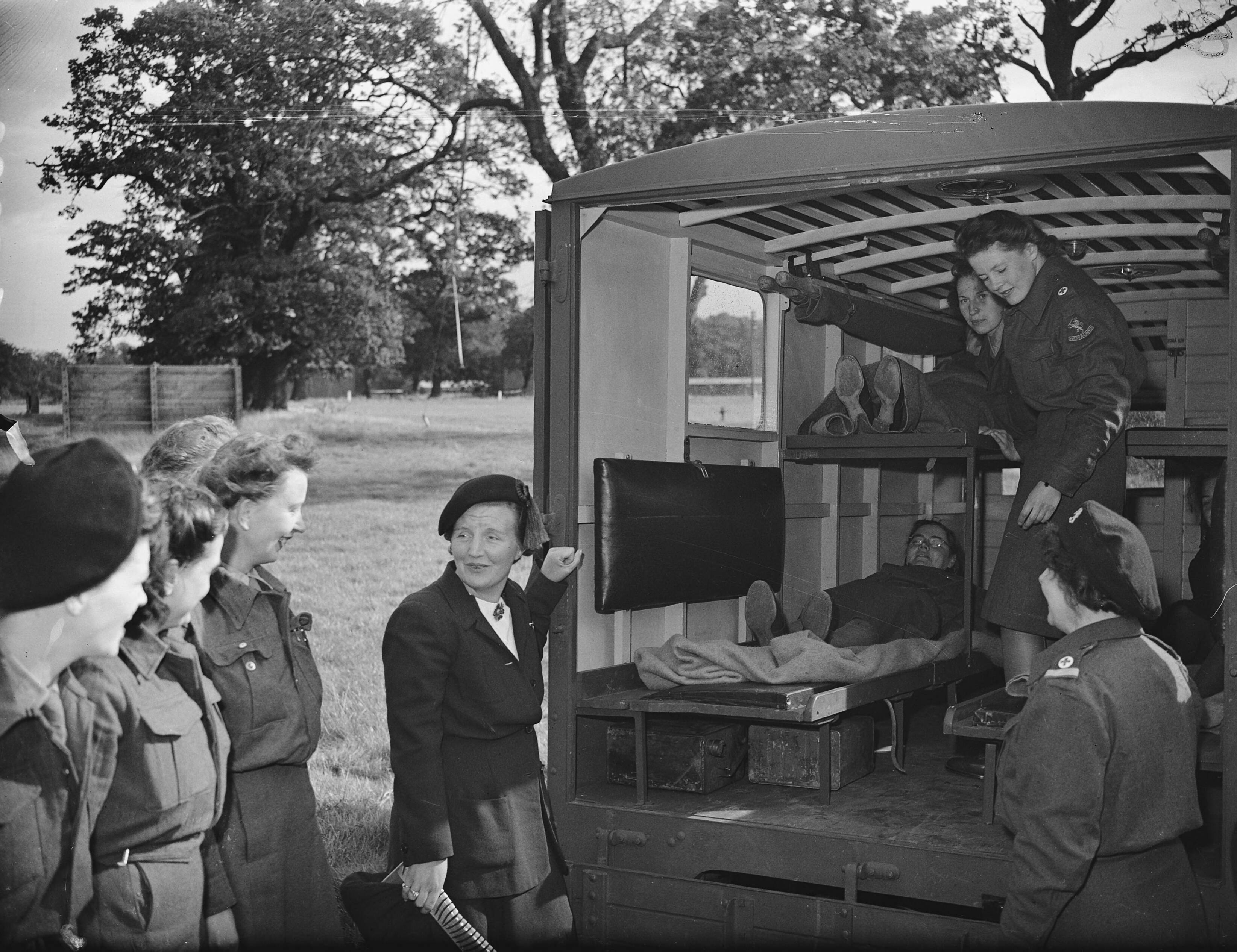 Bezoek van prinses Juliana aan het recent opgerichte Vrouwen Hulp Korps. Juliana bij een vrachtwagen ingericht als ambulance