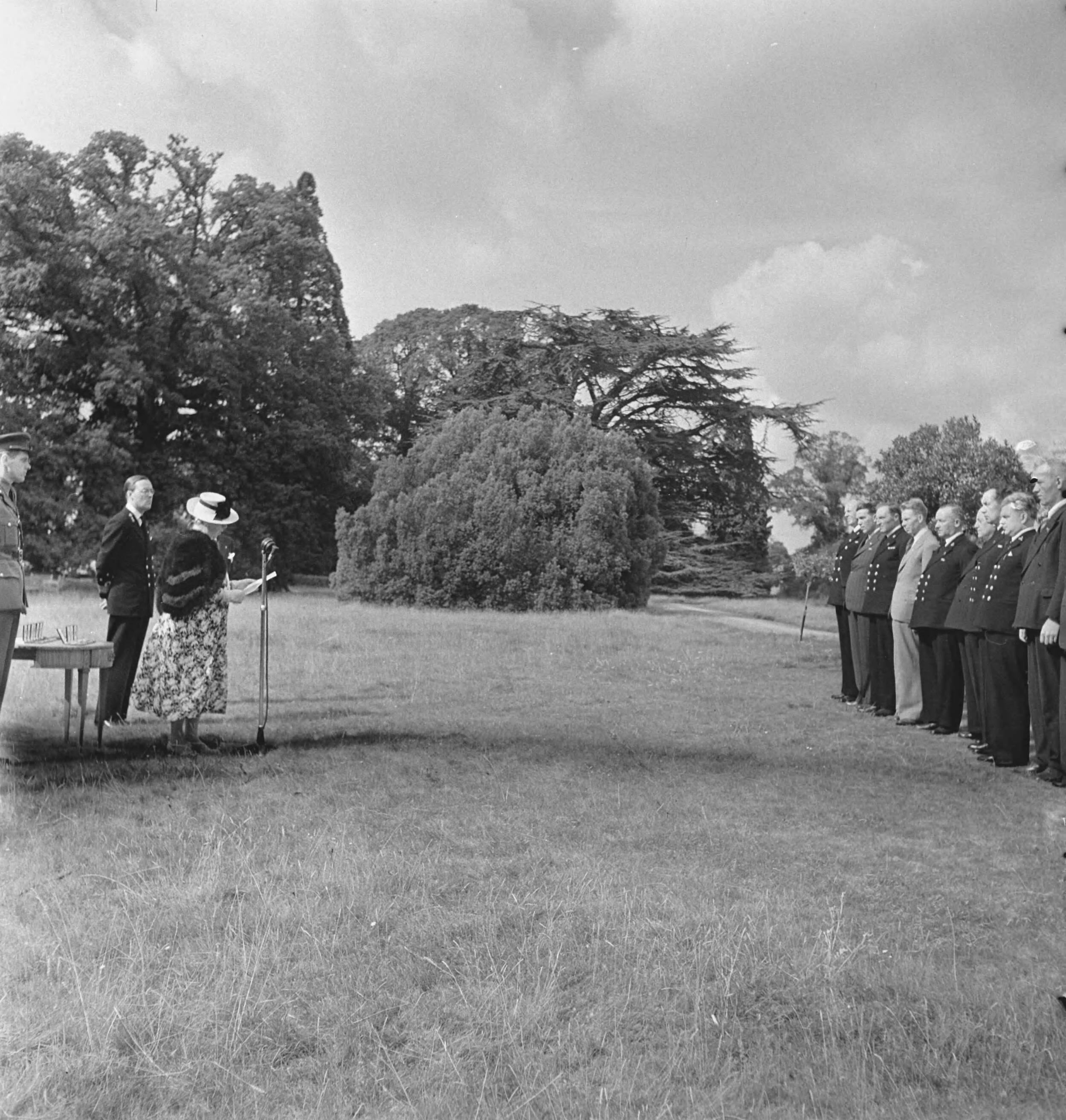 Toespraak van koningin Wilhelmina in de tuin van Stubbings House tot de gedecoreerden. Naast haar prins Bernhard
