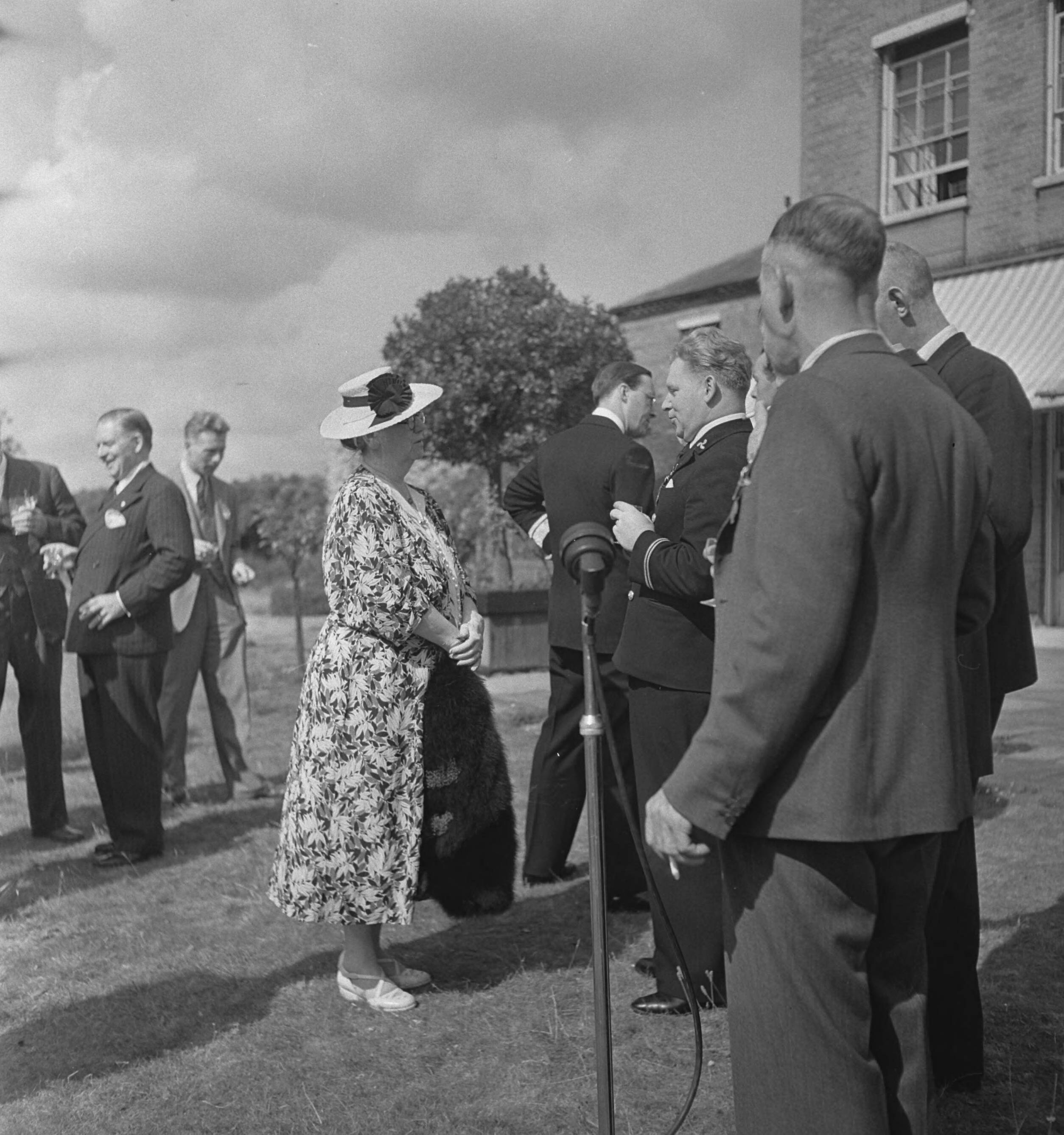 Tuin Stubbings House. Koningin Wilhelmina in gesprek met enkele gedecoreerden