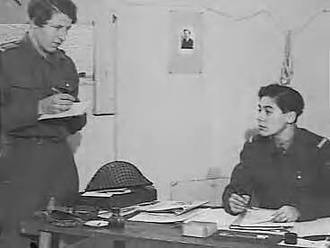 Vrouwen Hulp Korps. Detachementscommandant Emmy Rutten (rechts) geeft de dagorders door aan de groepscommandant Corrie Jones-de Rijk