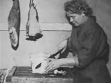 Vrouwen Hulp Korps. De chef van de keukenafdeling, Catherine Keuvelaar, snijdt vlees aan