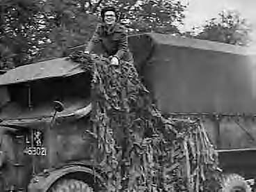 Vrouwen Hulp Korps. Chauffeur Marjory de Man bevestigt een camouflagenet aan een van de trucks