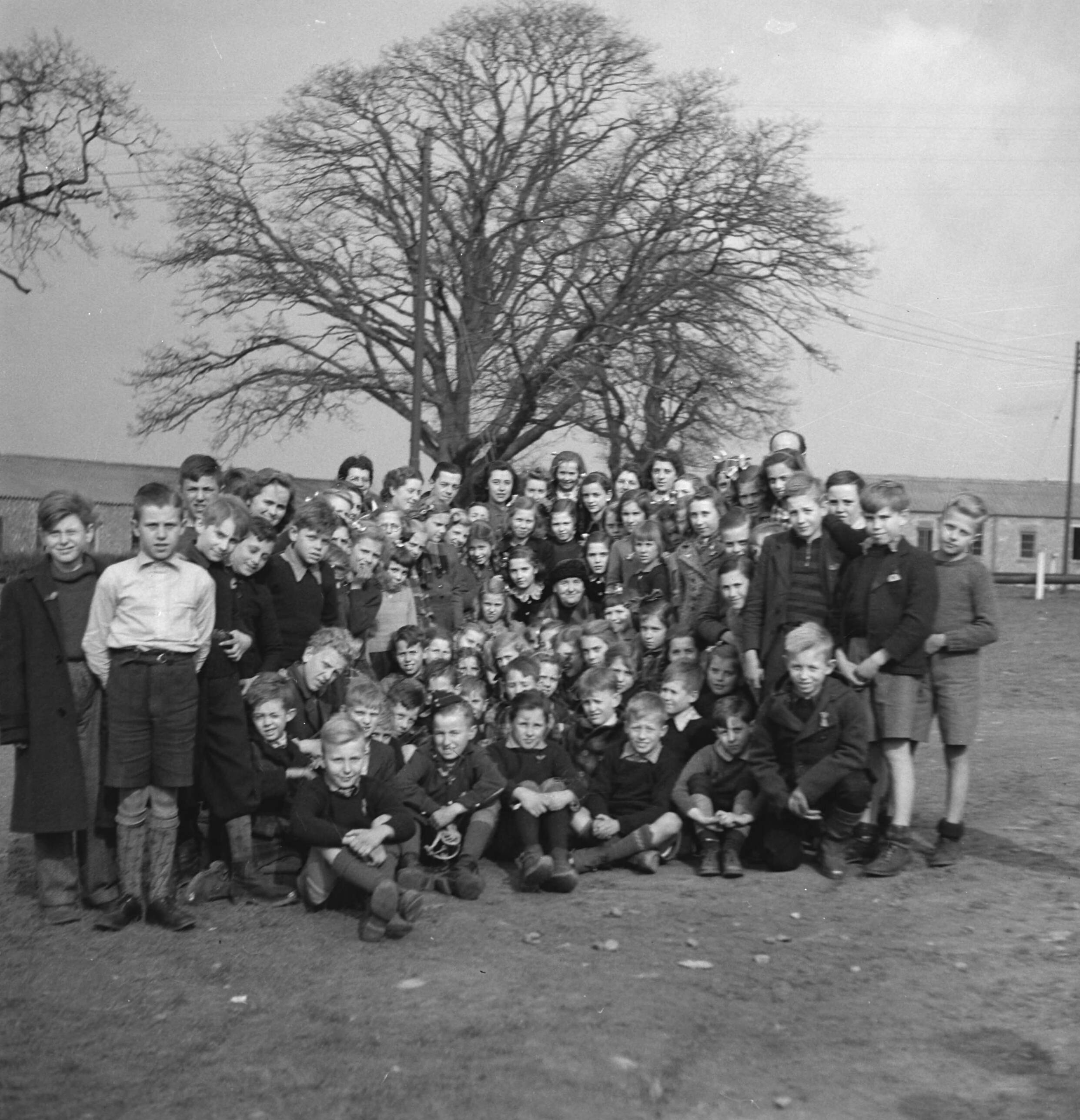 Nederlandse kinderen ("bleekneusjes") en begeleiding in Coventry. Groepsportret met koningin Wilhelmina in het midden