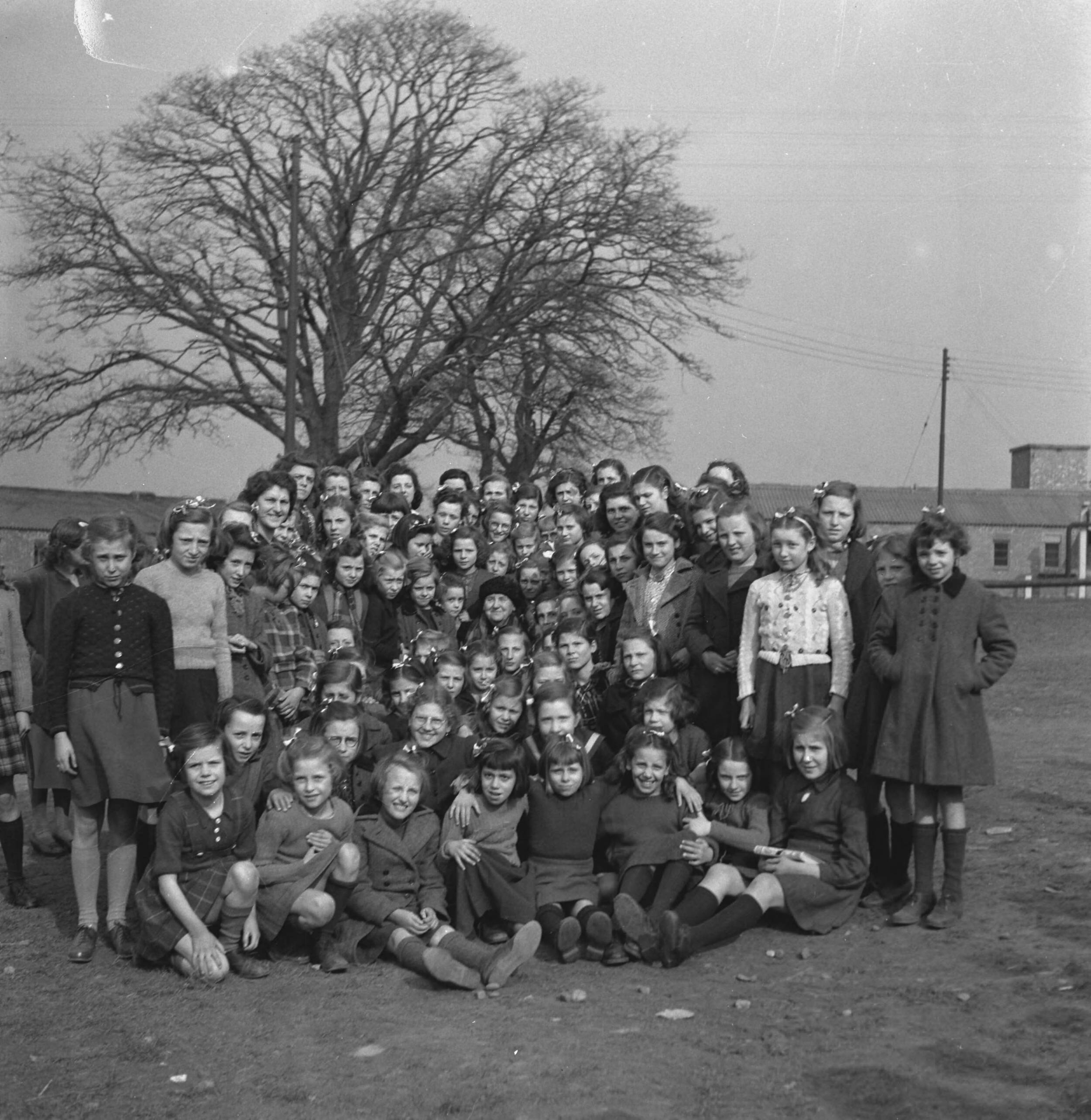 Nederlandse kinderen ("bleekneusjes") en begeleiding in Coventry. Groepsportret met koningin Wilhelmina in het midden