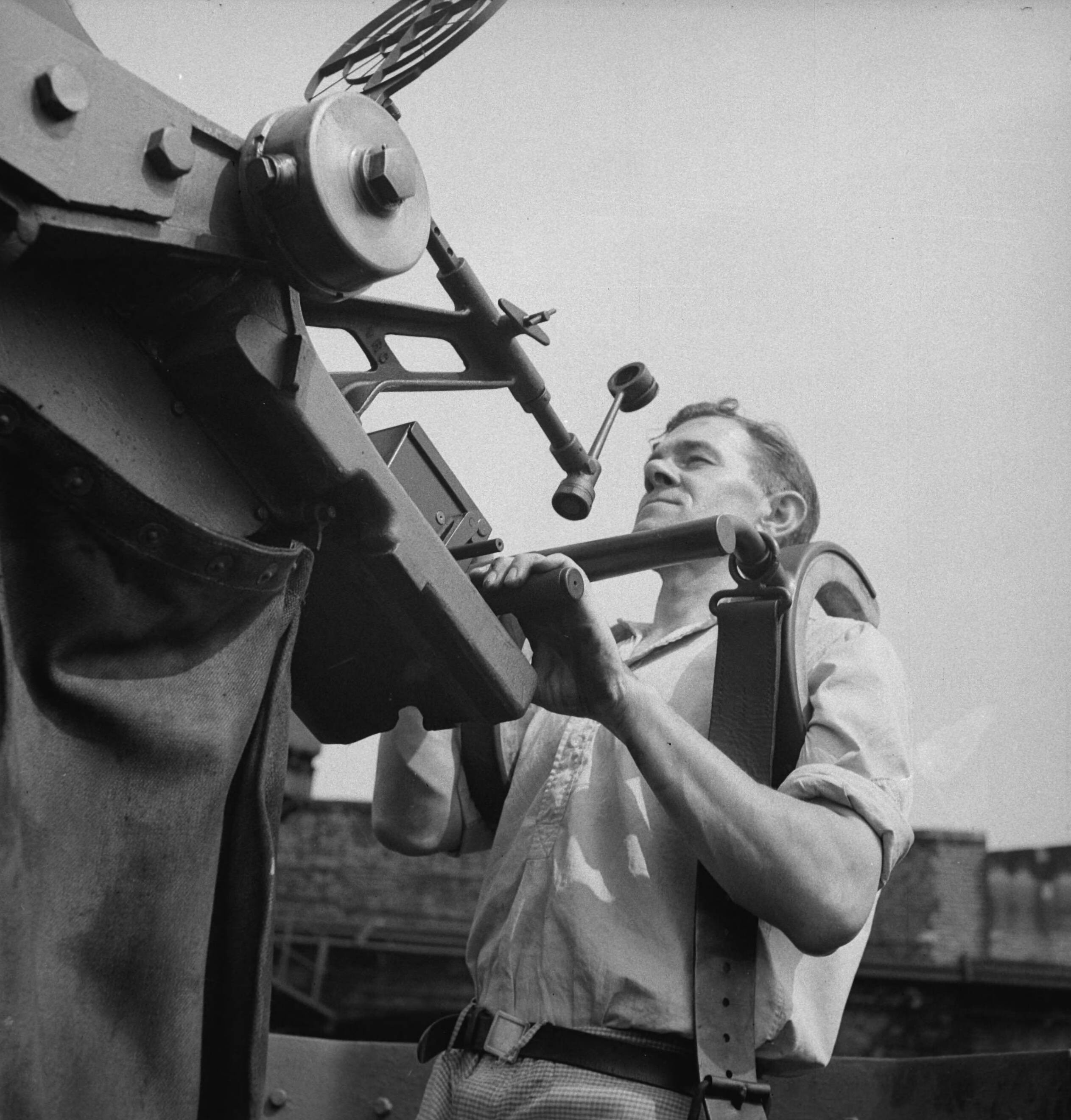 De kok bemant het afweergeschut op deze Nederlandse kustvaarder, nu in Groot-Brittannië